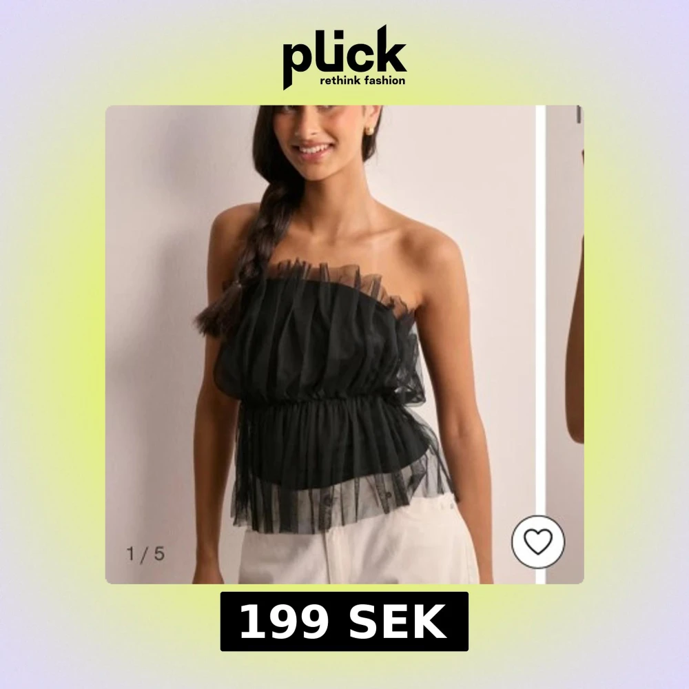 Snygg svart axelbandslös topp med volangdetaljer och elastisk midja. Perfekt för en stilren look.