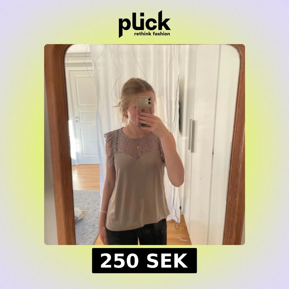 Supersöt beige blus från Vero Moda med spets upptill och volangdetaljer vid axlarna. Ärmlös modell med rund halsringning och snyggt spetsmönster som ger en romantisk vibe. Perfekt att styla med jeans eller kjol för en trendig look. Storlek M men fungerar för S också.