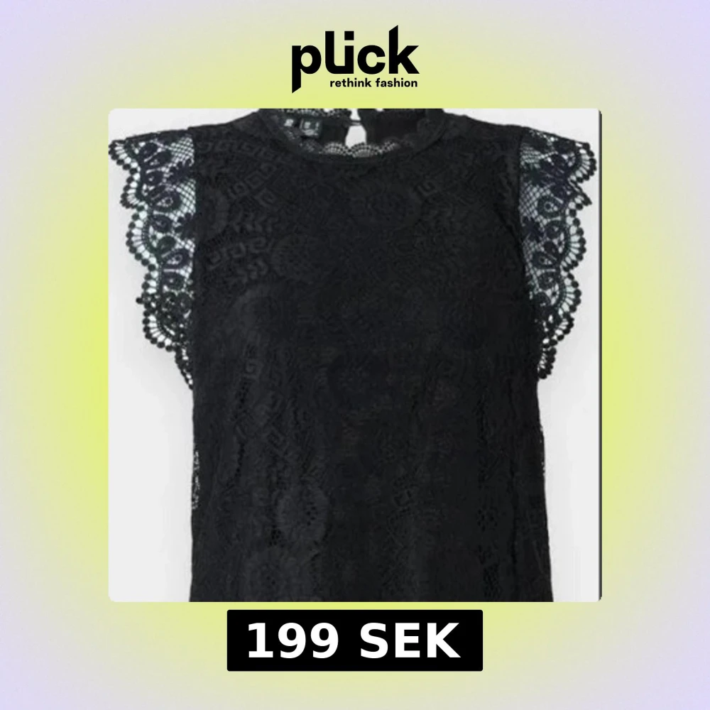 Supersnygg svart blus i spets med detaljerade volangärmar och hög hals. Blusen är ärmlös med vackert mönstrad spets och har en feminin, elegant look. Perfekt att styla med jeans eller kjol för en trendig outfit.