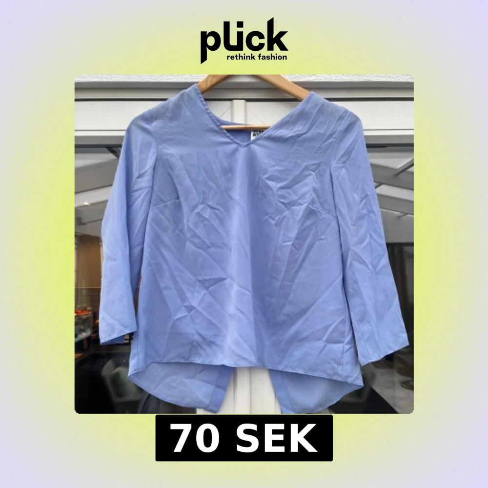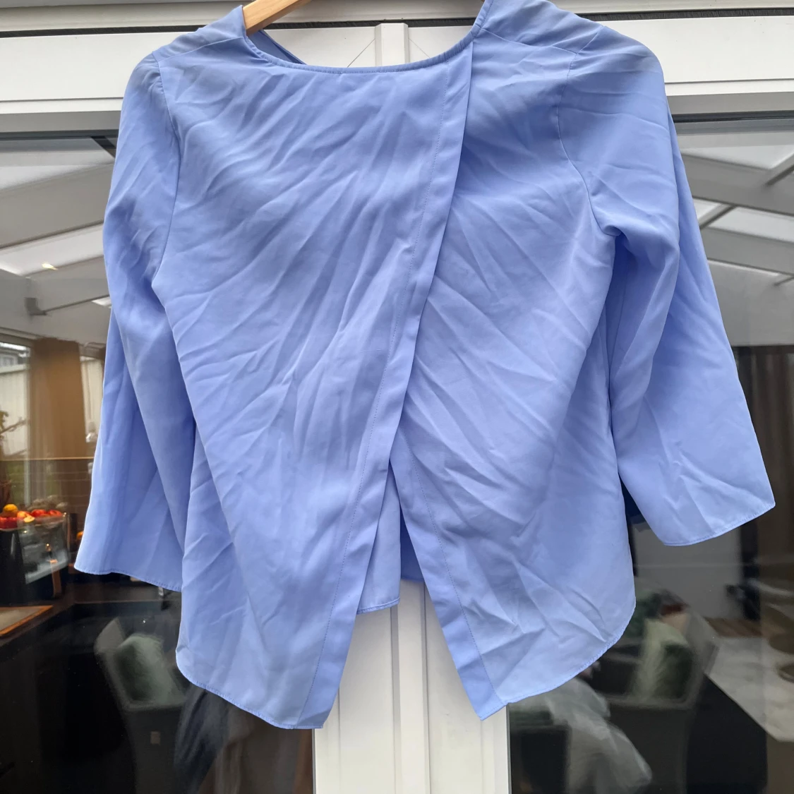 Säljer en ljusblå blus från Vero Moda med v-ringning och trekvartsärm. Blusen har en snygg omlott-detalj baktill och är längre bak än fram för en cool look. Perfekt att styla med jeans eller kjol.