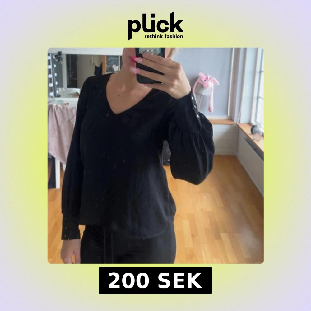 Säljer en svart blus med v-ringad hals och långa puffärmar. Ärmsluten har knappar som snygg detalj. Perfekt för dig som gillar en stilren look med lite extra volym i ärmarna.