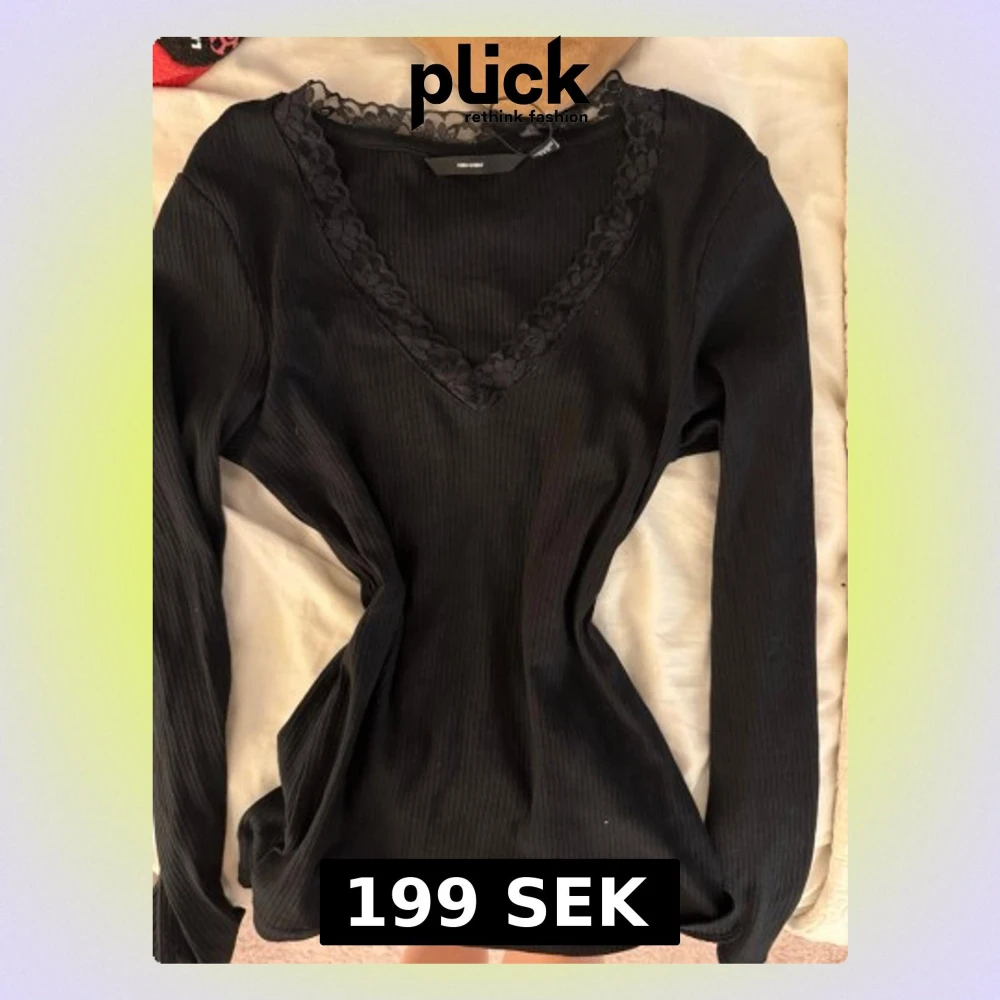 Svart långärmad topp från Vero Moda med ribbad struktur och v-ringad hals. Halsringningen är dekorerad med snygg spetskant som ger en extra detalj. Modellen är figurnära och stretchig, perfekt till jeans eller kjol.