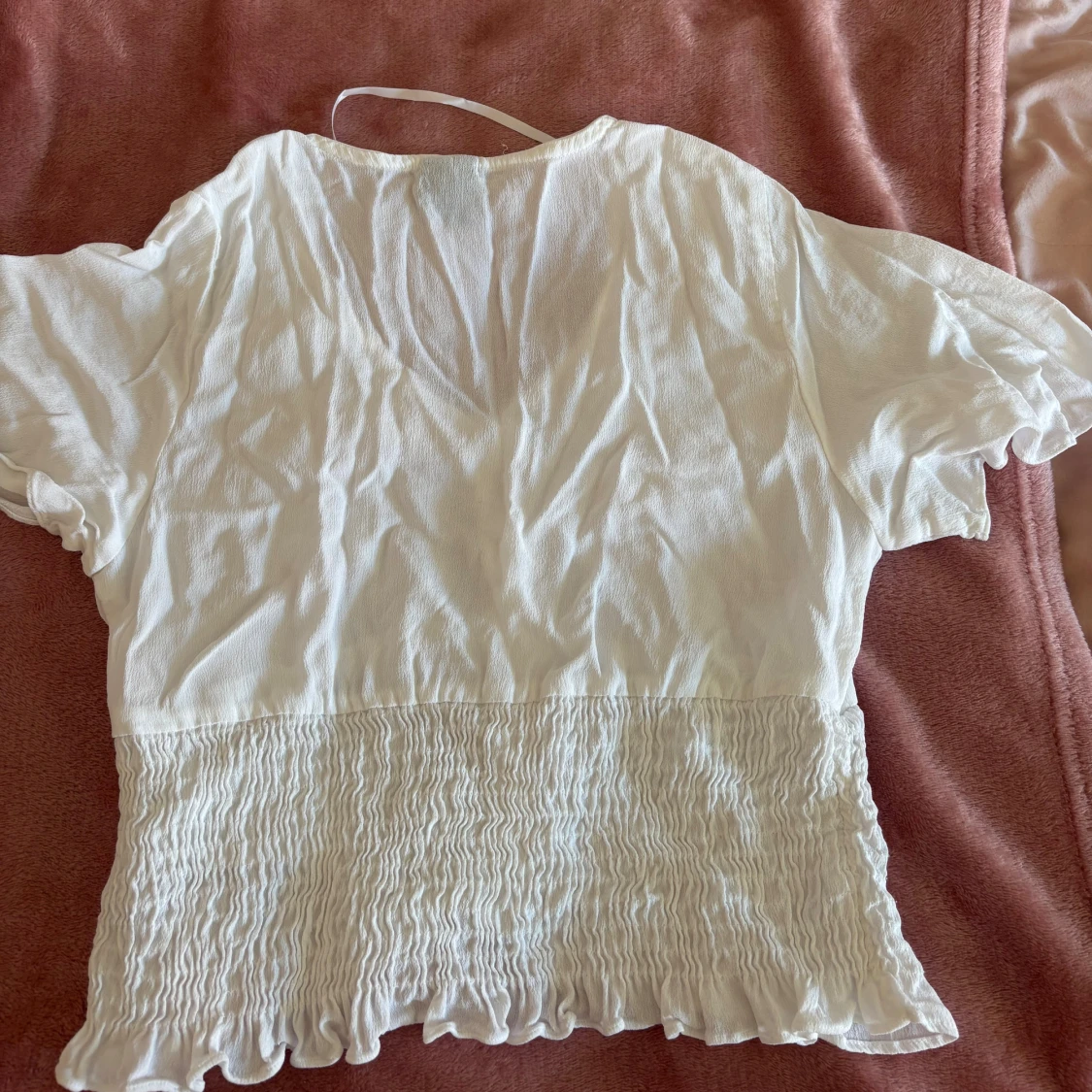 Supersöt vit blus från Vero Moda med korta ärmar, v-ringning och knappar framtill. Den är croppad med smockad midja och volangkant nertill🫶🏻 Storlek Xs