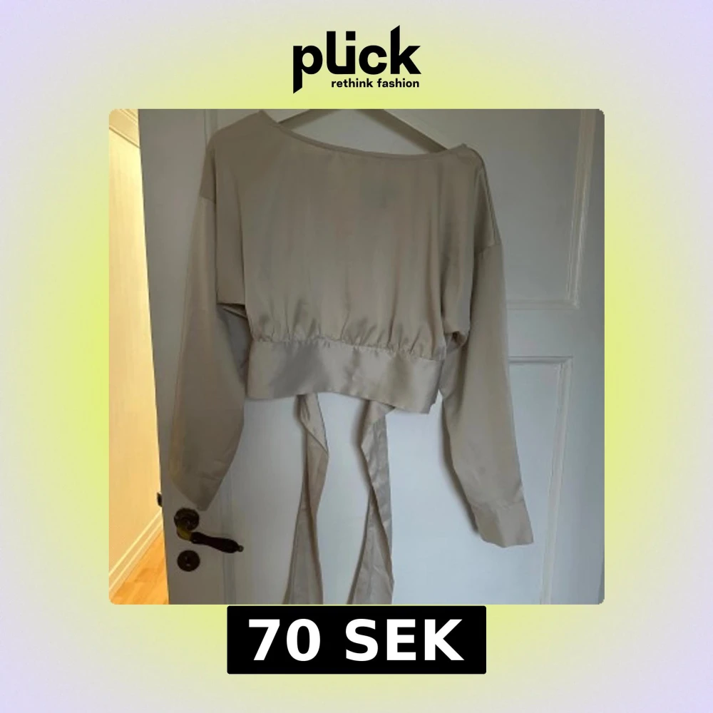 Säljer en beige omlottopp från Vero Moda med långa ärmar och breda manschetter med knappar. Toppen har ett snyggt omlottband i midjan som kan knytas och en öppen rygg för extra stilpoäng. Materialet är mjukt och har en lätt glansig finish.
