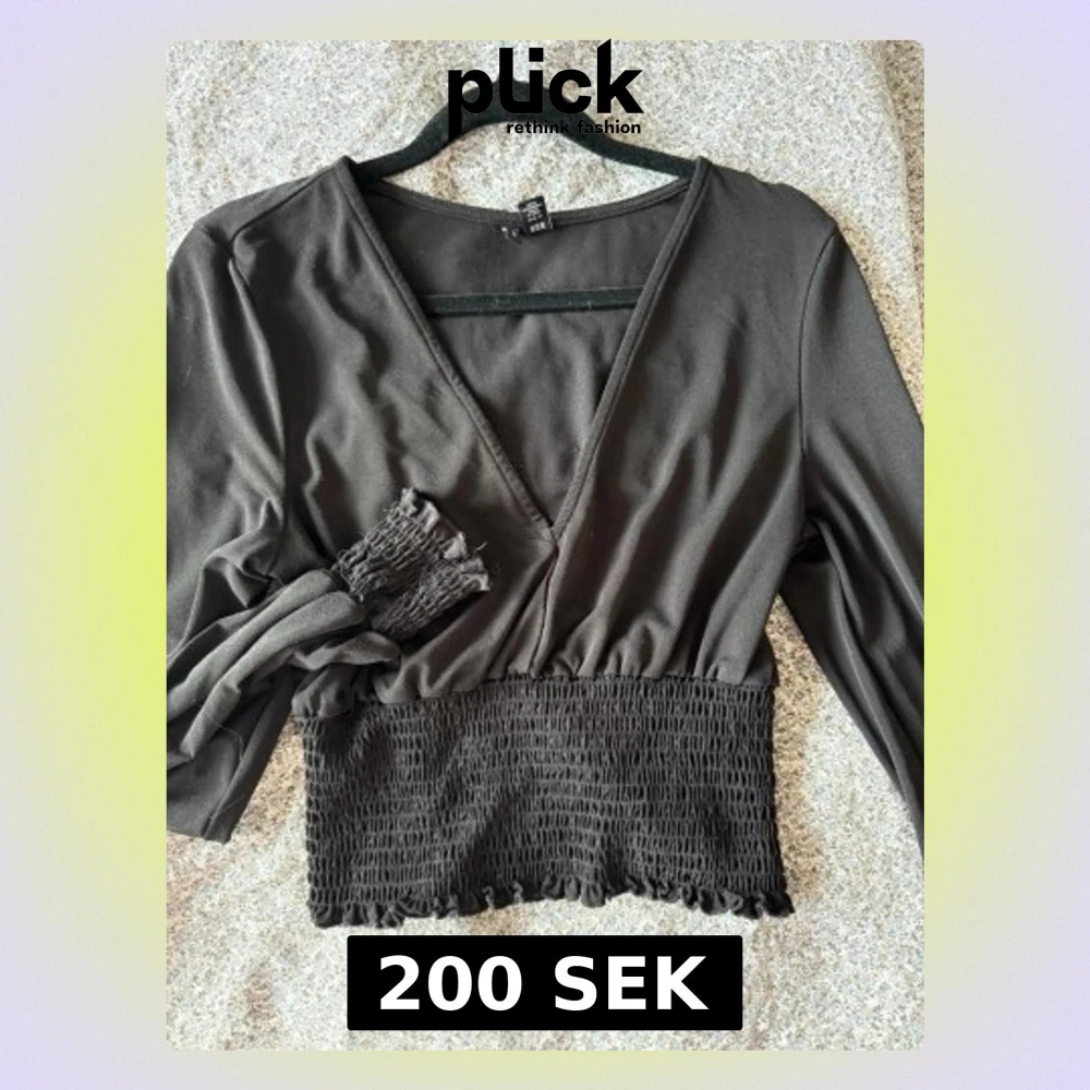 Trendig svart omlottopp från Vero Moda med v-ringning och långa ärmar. Toppen har smockad midja och ärmar för en snygg passform. Perfekt att styla med höga jeans eller kjol. Materialet känns mjukt och lätt mot huden.