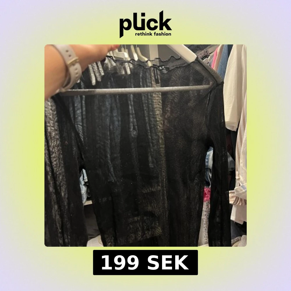 Säljer en svart, transparent mesh tröja med långa ärmar. Toppen har en lösare passform och är perfekt för att styla lager på lager. Tunn och stretchig med diskret volangkant vid halsen. Superenkel att matcha till olika outfits.