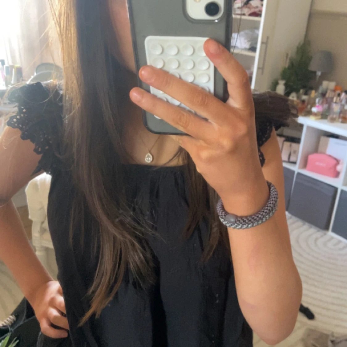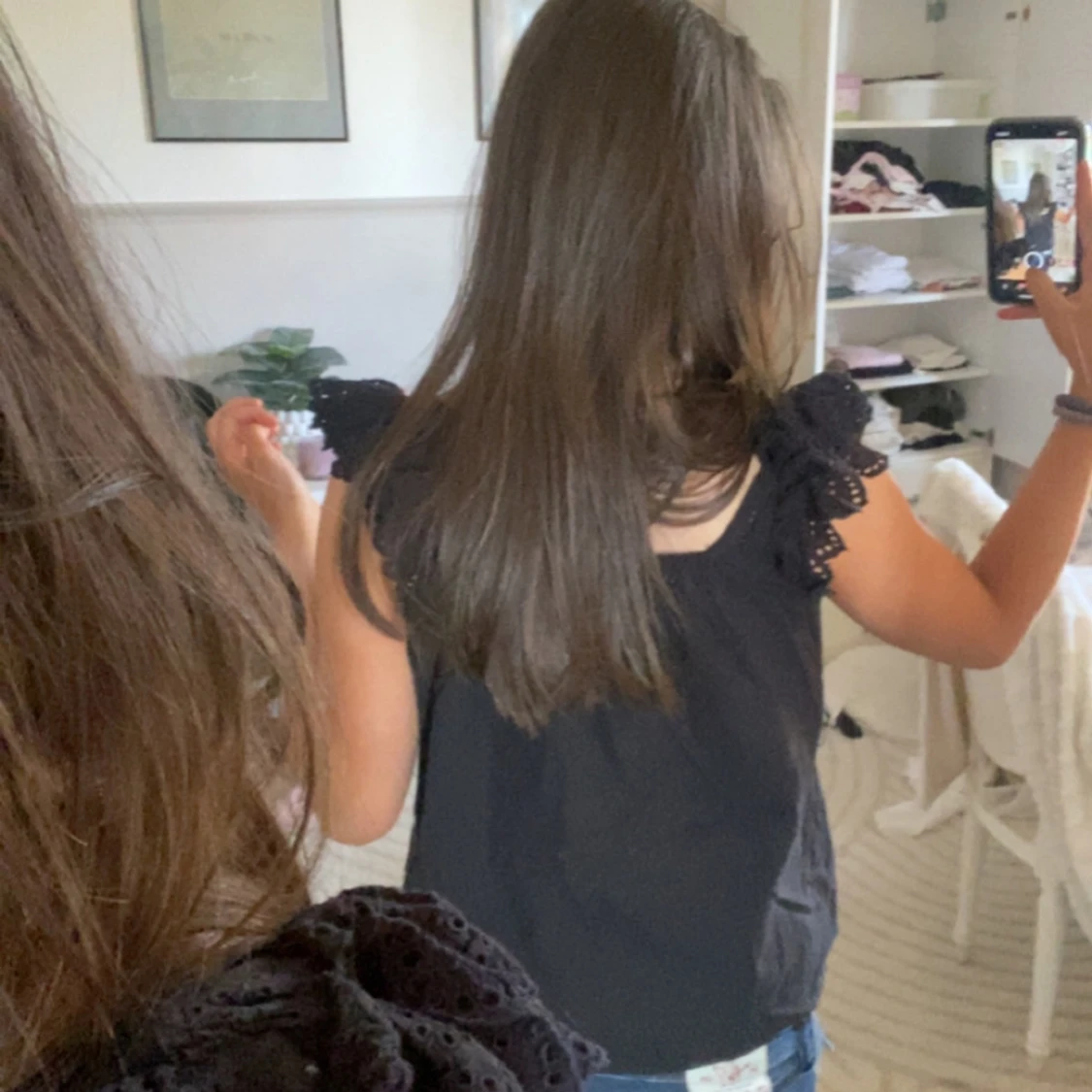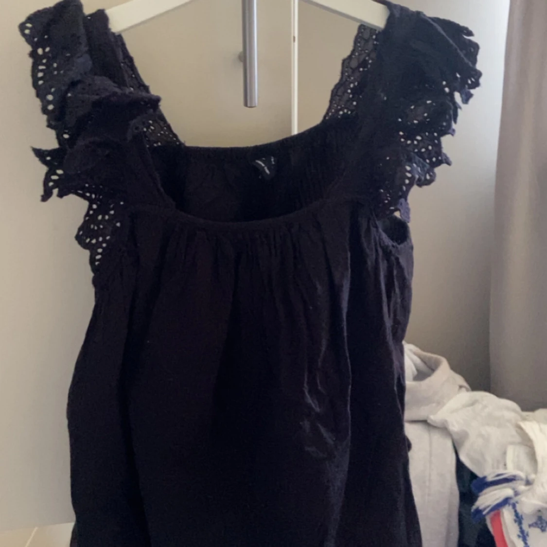 Säljer en snygg svart ärmlös topp med vackra spetsdetaljer på axlarna. Perfekt för en stilren look. Toppen har en rund halsringning och en luftig passform. Passar bra till både jeans och kjol. Hör av dig vid intresse!