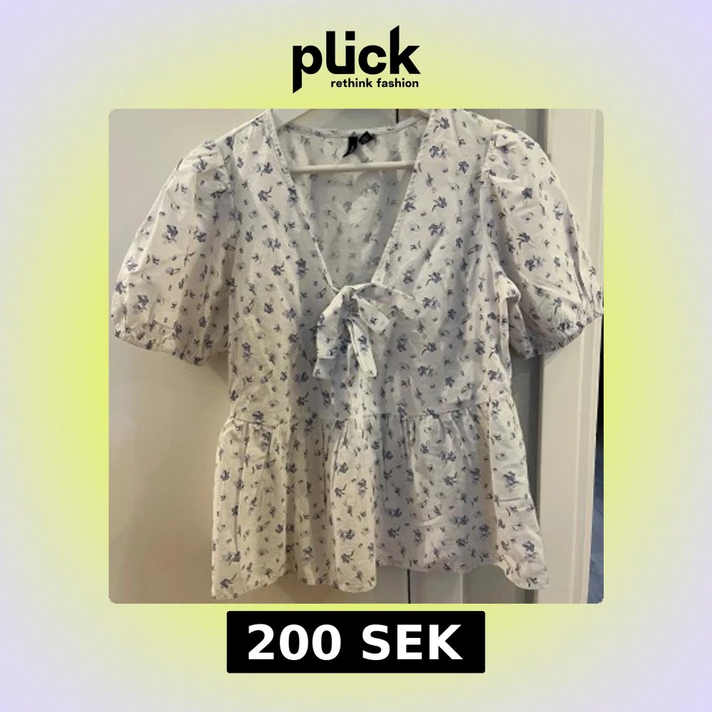 Supersöt vit blus med blått blommönster, puffiga korta ärmar och v-ringning med knyt fram. Blusen har en luftig passform och volang nedtill, perfekt för en fräsch och romantisk look. Tillverkad i mjuk bomull som känns skön mot huden.
