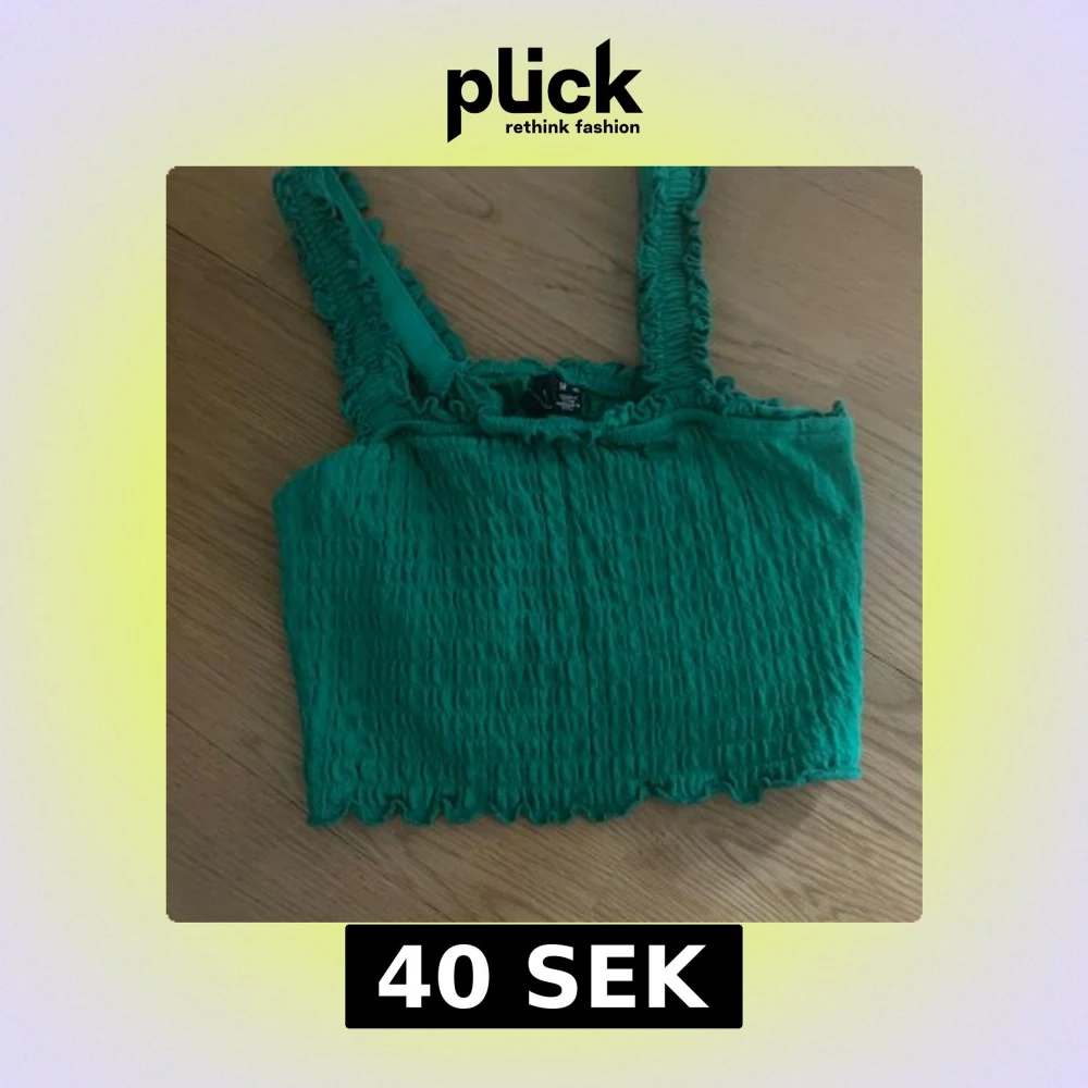 Grön smockad linnetopp från Vero Moda i storlek XS. Toppen har breda axelband med volangkant och en croppad passform. Materialet är stretchigt och har en vågig kant nertill för en extra söt look.