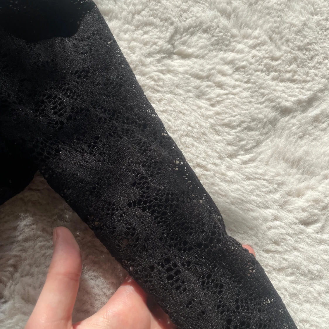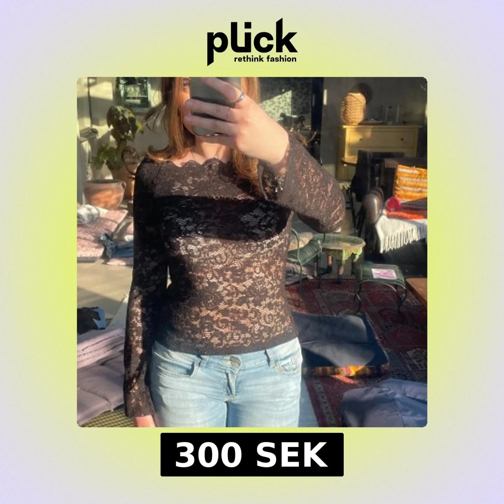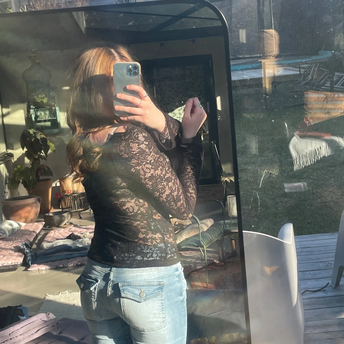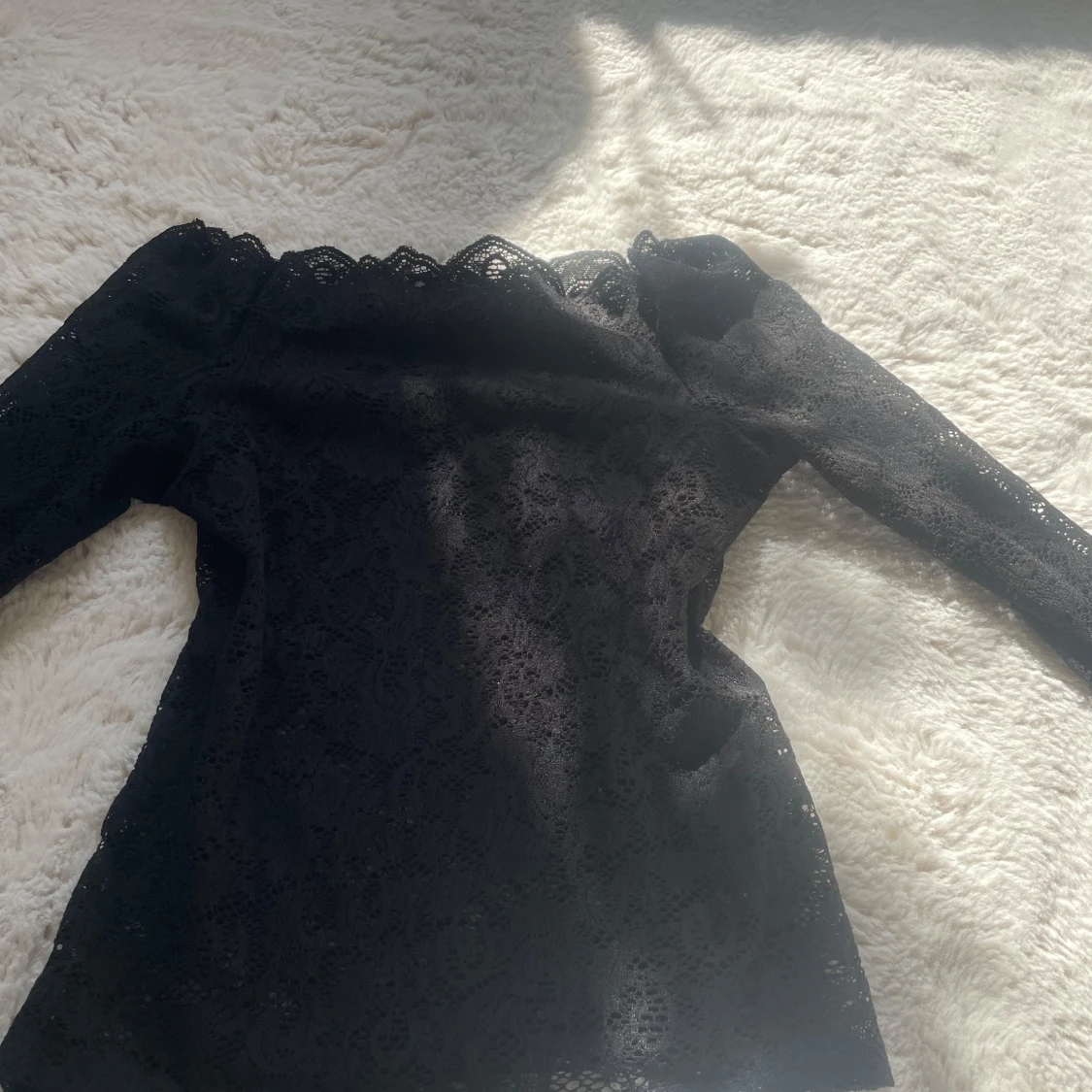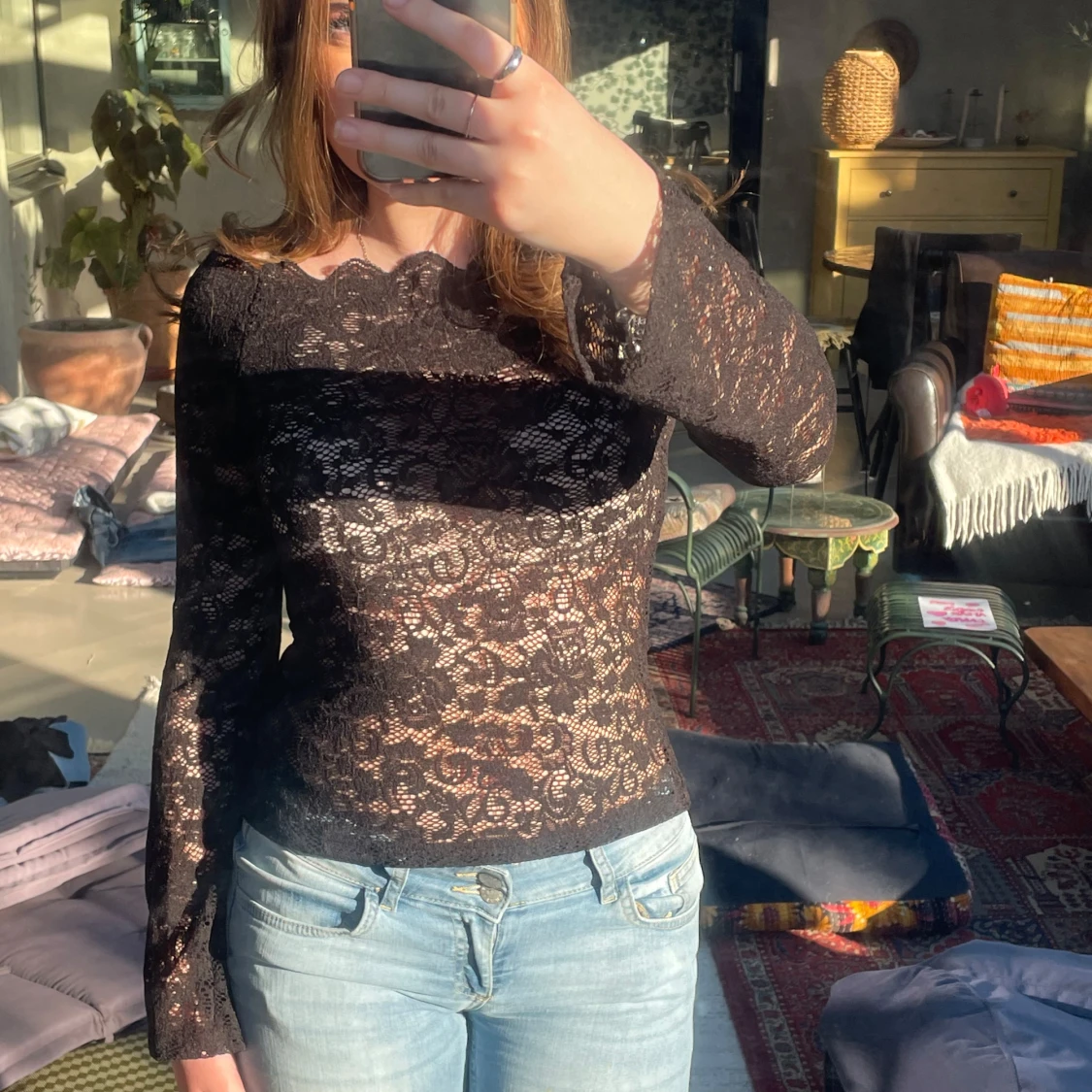 Säljer en elegant svart spetsblus med långa ärmar och en vacker vågig kant vid halsringningen. Perfekt för en stilren look. Blusen är genomskinlig men kan fortfarande bäras utan linne!