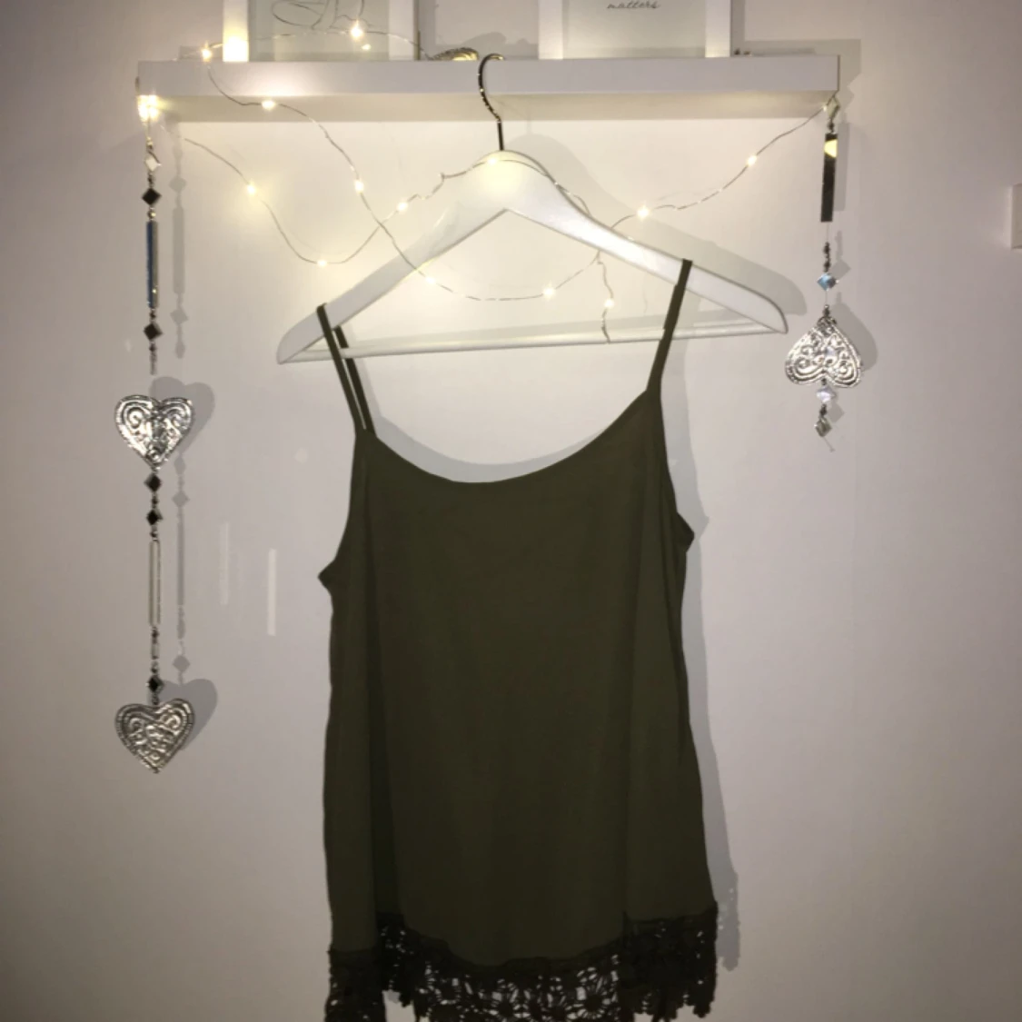 Fint militärgrönt linne med kord i ryggen och fin spets nertill. Säljer pga använder inte. ♡ Kan mötas upp i Växjö, annars står köparen för frakt. Betalning sker helst via swish men funkar inte det så går det att lösa! Bara kontakta mig om du har frågor eller vill se mer! ♡