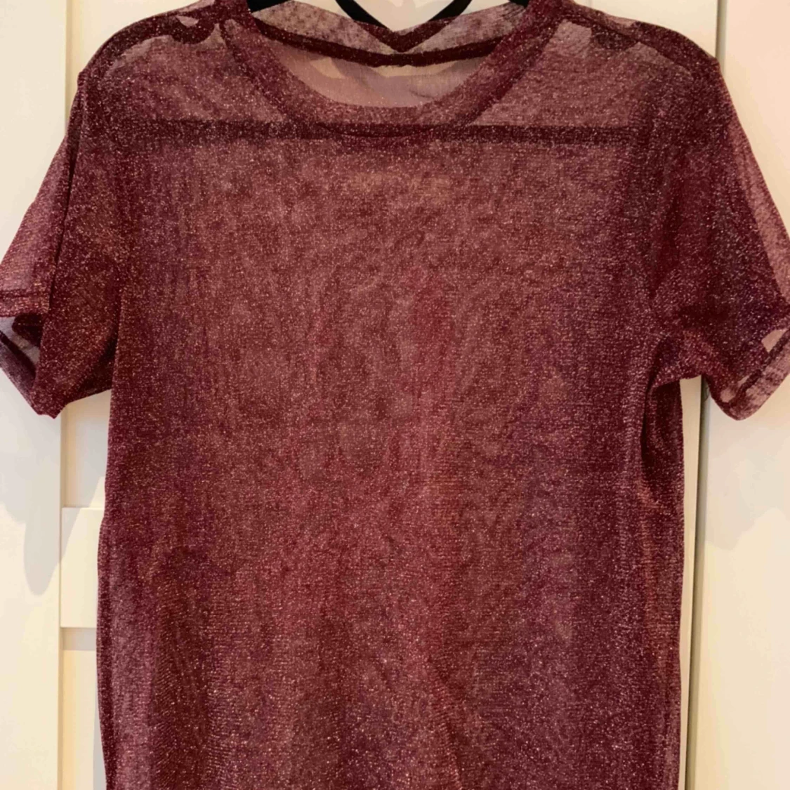 Genomskinlig glittrig vinröd topp. Använd en gång men kappe bortklippta. Rak i passform.