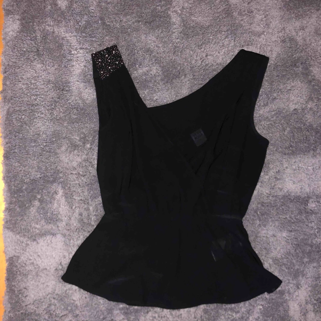 Svart ”festlinne” som går omlott. Djup i ryggen med glitterdetaljer på ena axeln!