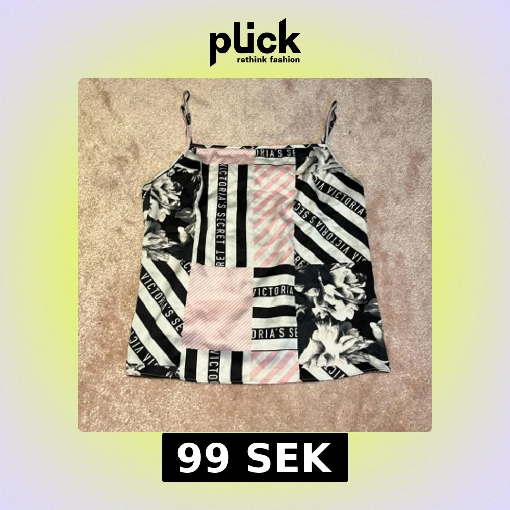 Snygg linnetopp från Victoria's Secret med tunna axelband. Öppen rygg. Toppen har ett patchworkmönster med svarta och vita ränder, rosa detaljer och blommor. Materialet är glansigt och tunt, perfekt för att sticka ut. Loggan syns tydligt i designen. Skulle tro att den är xxs eller xs, kort i längd