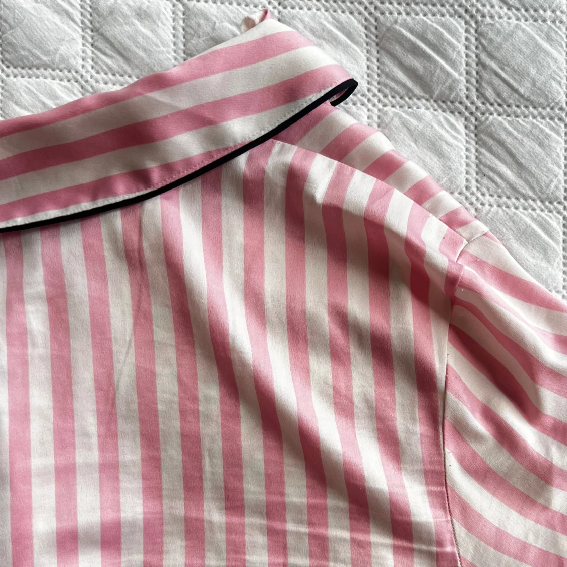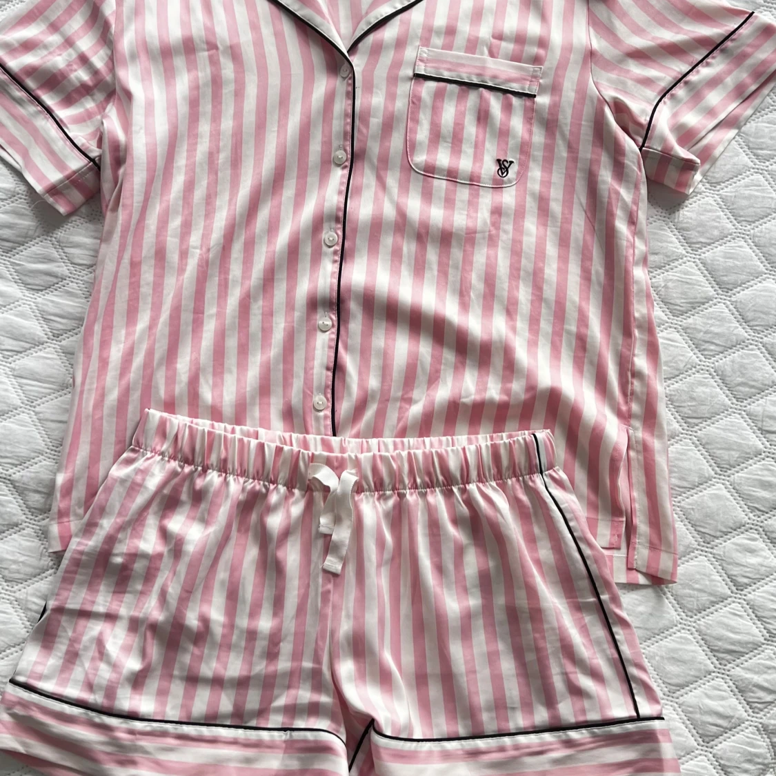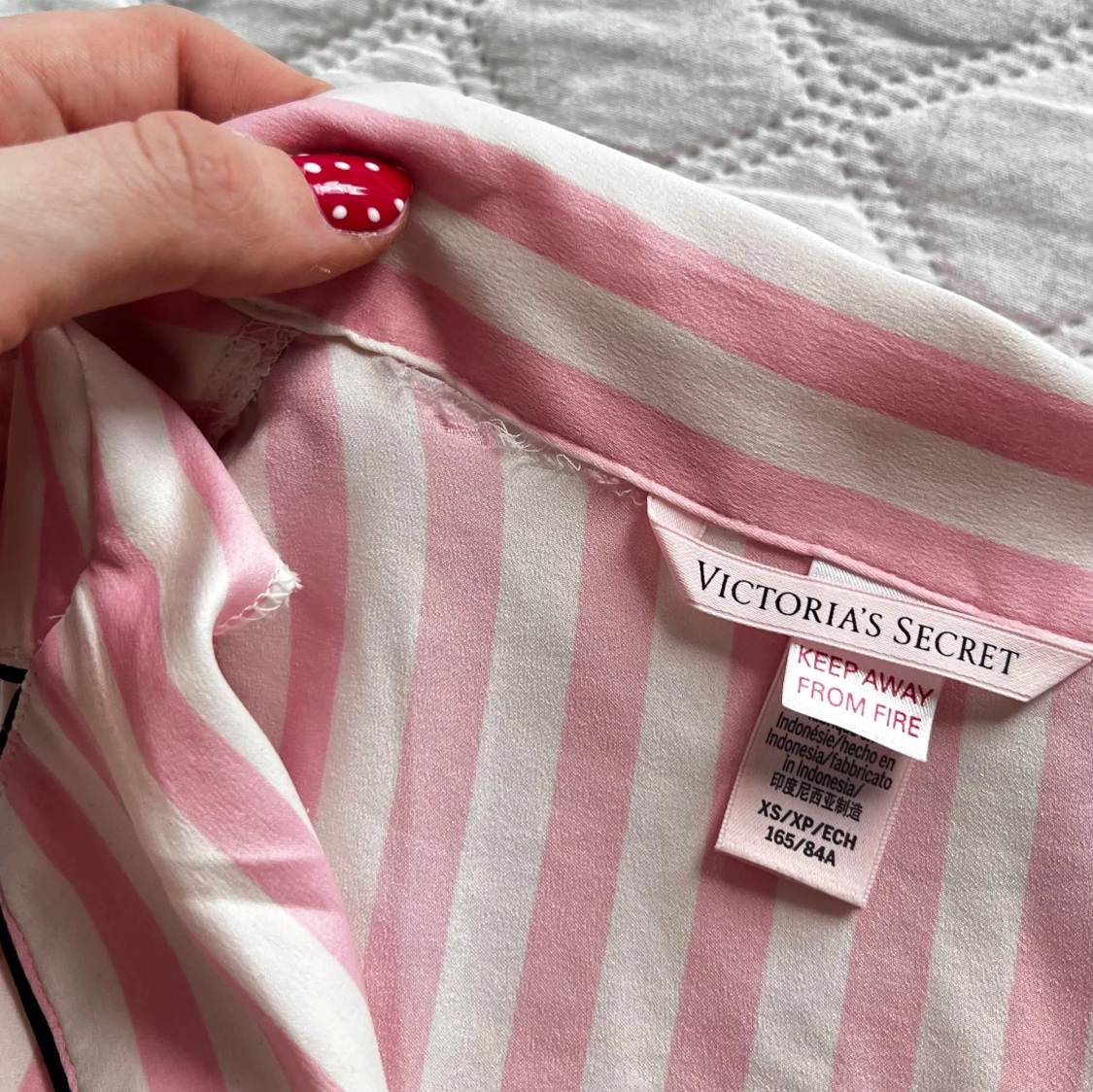 Säljer min Victoria Secret Pyjamas i storlek XS. Köptes på Victoria Secret butiken i London i december 2024. Tyvärr lite för liten för mig, därav har den även spräckts i sömmen. Ingenting som syns eller är märkbart på då det är precis i nacken, och täcks utav nackkragen på baksidan (Se sista bilden) Köpte den för 1200kr 🩷