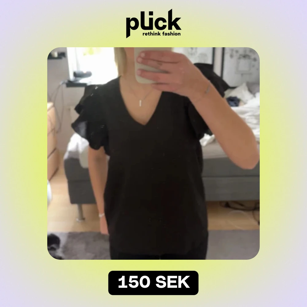 Säljer en elegant svart blus från VILA i storlek 34. Blusen har en v-ringad design och korta ärmar med volangdetaljer som ger en fin touch. Perfekt för både vardag och fest!