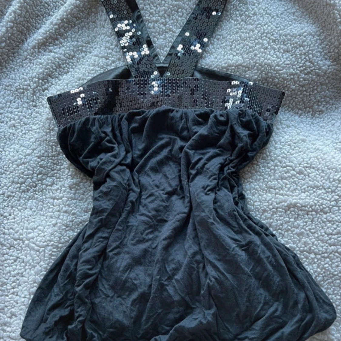 Säljer en svart/ mörkgrå haltertopp från Vila i storlek M. Toppen har breda axelband och överdel dekorerad med glittriga paljetter. Materialet är mjukt och följsamt, perfekt för dig som vill sticka ut.