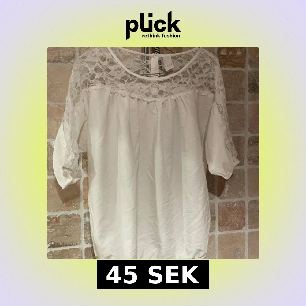 Supersöt vit blus från VILA med transparent spets upptill och på ärmarna. Blusen har rund halsringning och trekvartsärmar med spetsdetaljer.