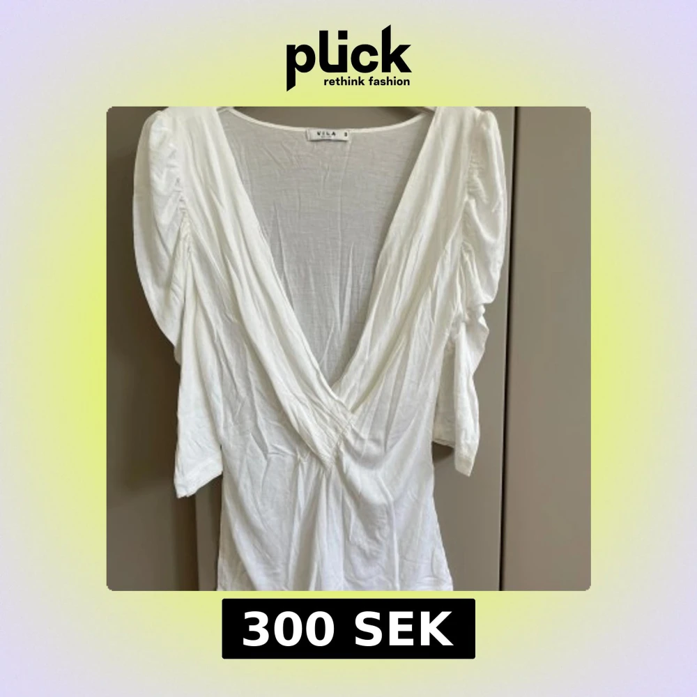 Säljer en vit topp från Vila i storlek S. Toppen har djup v-ringning, korta puffärmar och är tillverkad i mjukt, tunt modaltyg. Perfekt för dig som gillar en luftig och stilren look med snygga detaljer vid axlarna.