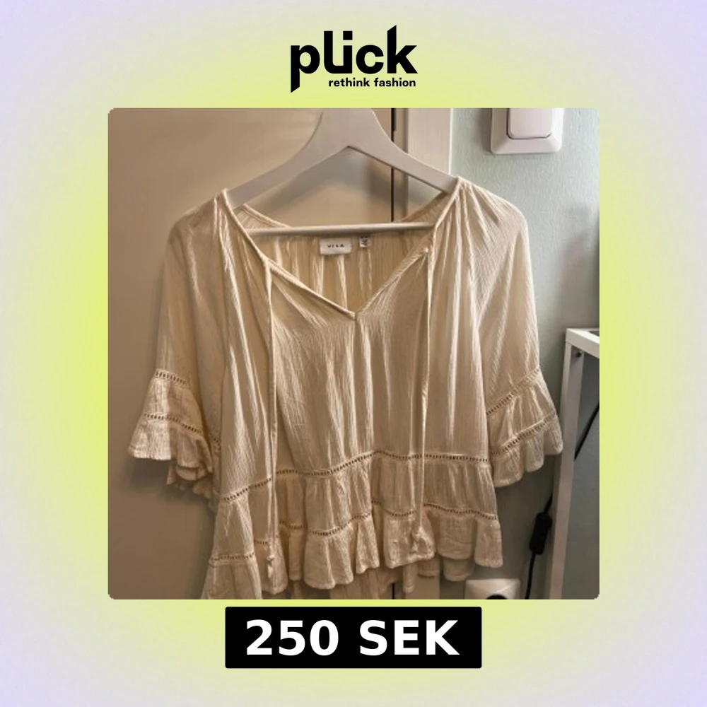 Supersöt krämvit blus från Vila med v-ringning och knytband fram. Blusen har korta volangärmar och flera volanglager nertill samt fina spetsdetaljer. Luftigt, lätt material som känns perfekt för varmare dagar.