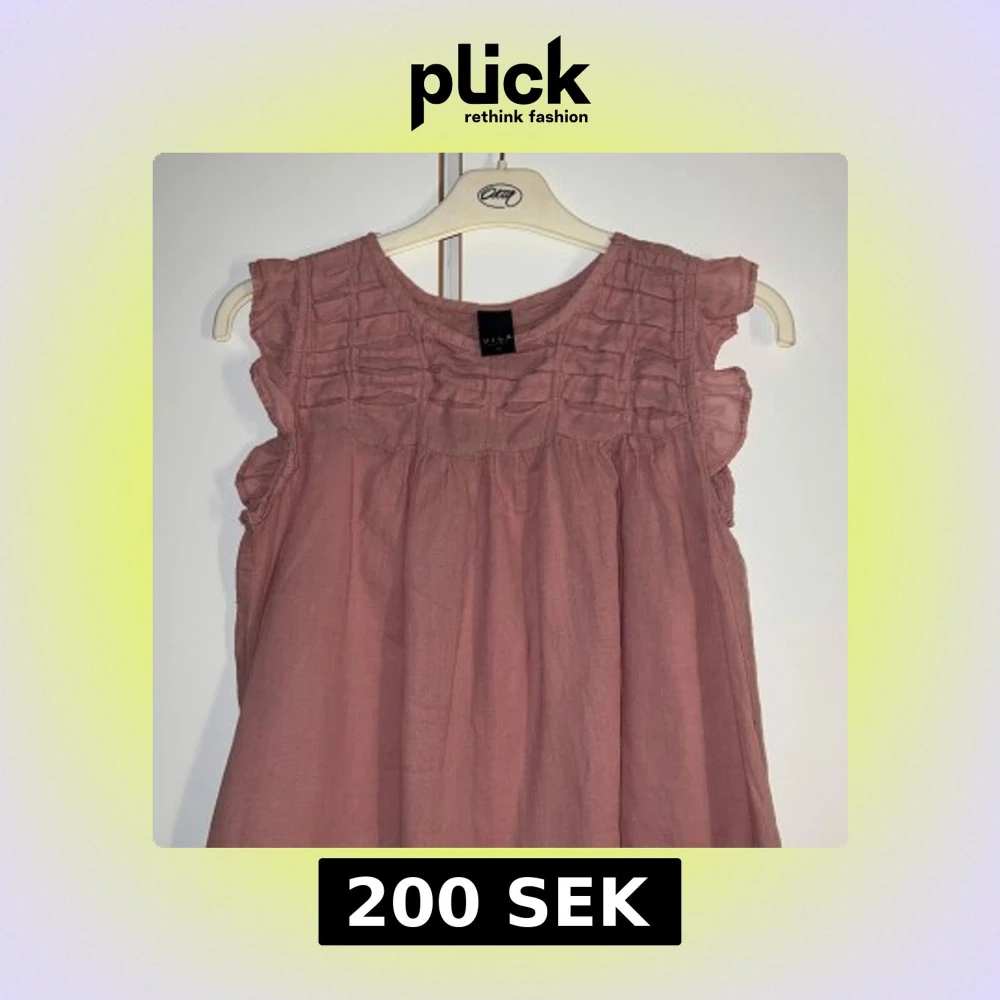 Supersöt rosa blus/linne från Vila med volangdetaljer vid axlarna och rynkade partier upptill. Klänningen är ärmlös och har en luftig, flowy passform som känns perfekt för varmare dagar. Tillverkad i ett lätt bomullstyg.