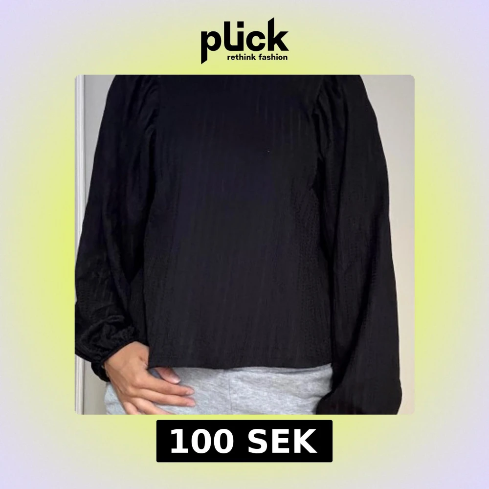 Säljer en svart blus med diskret strukturmönster och rund halsringning. Blusen har långa puffärmar med resår vid handlederna och en rak.