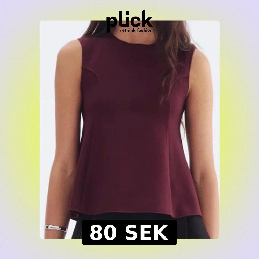 Säljer en stilren vinröd peplum topp. Toppen är ärmlös med rund hals och har en lätt utsvängd passform som ger en snygg siluett. Materialet är mjukt och har en slät yta, perfekt för att lyfta din look. Passar dig som gillar minimalistisk stil.