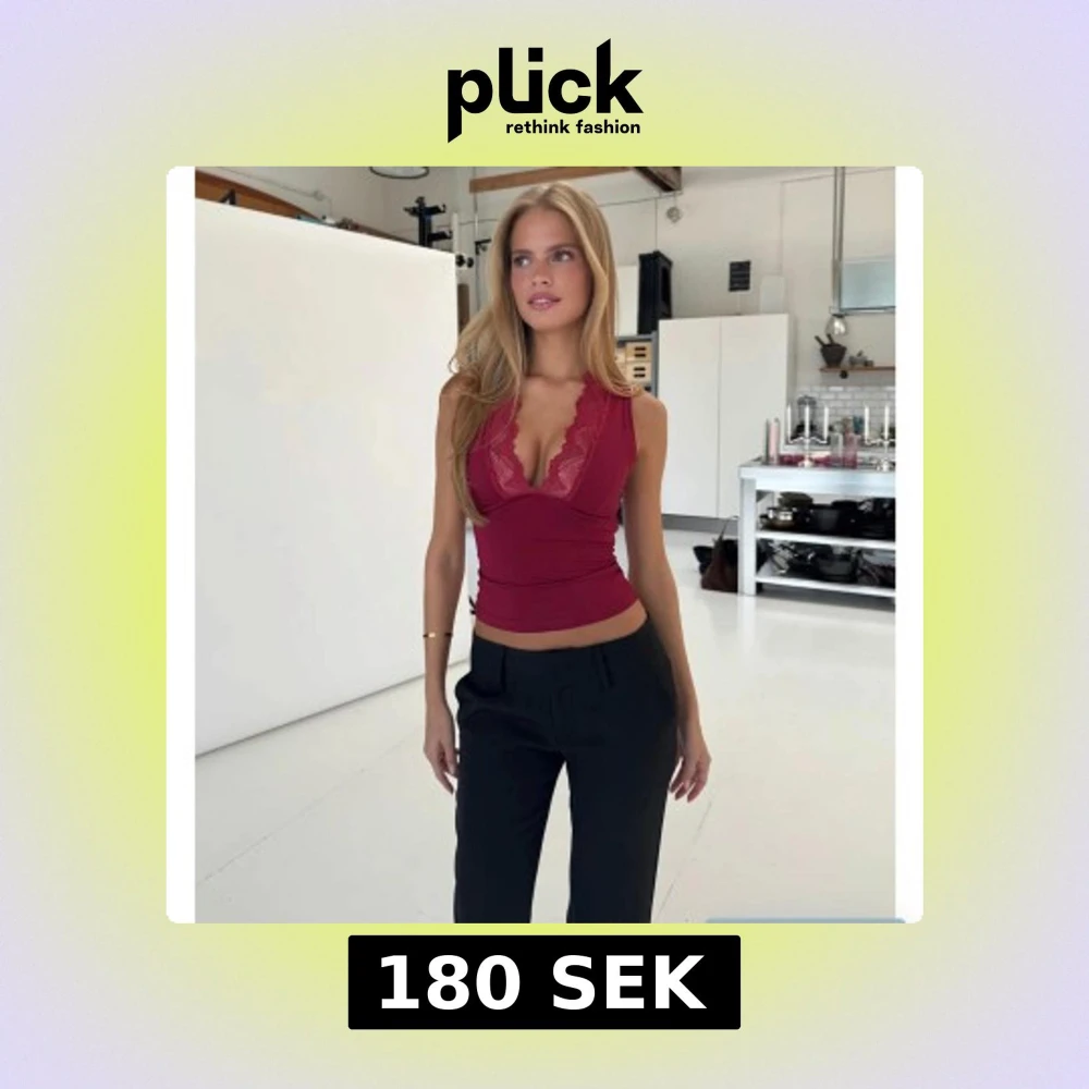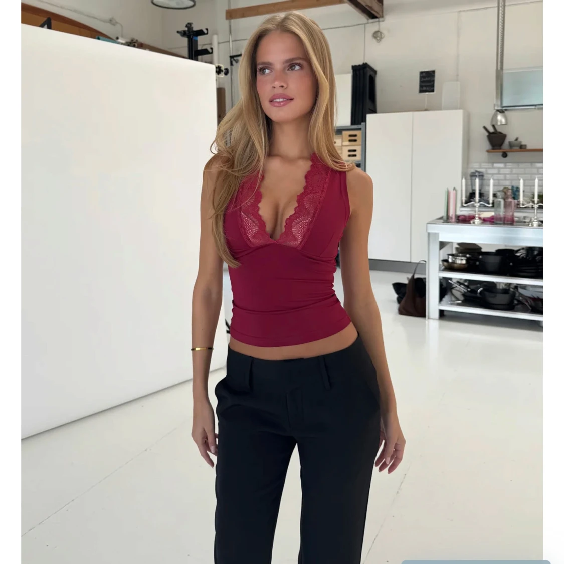 Topp från Venderbys, helt oanvänd med prislapp kvar. Vinröd ärmlös topp med djup v-ringning och breda spetsdetaljer längs urringningen. Figurnära passform och croppad längd, perfekt att styla med höga byxor. Toppens material är stretchigt och mjukt för en bekväm känsla.