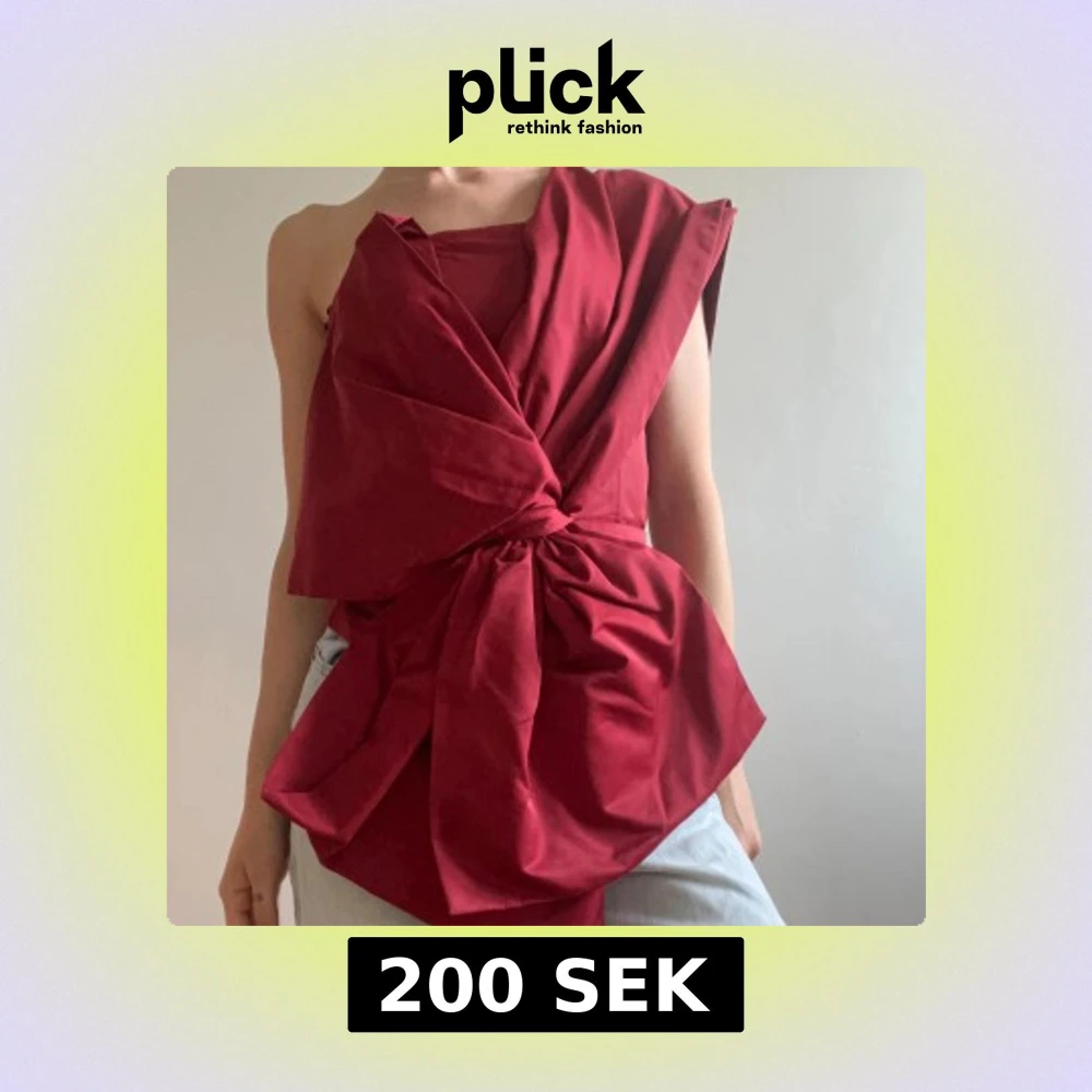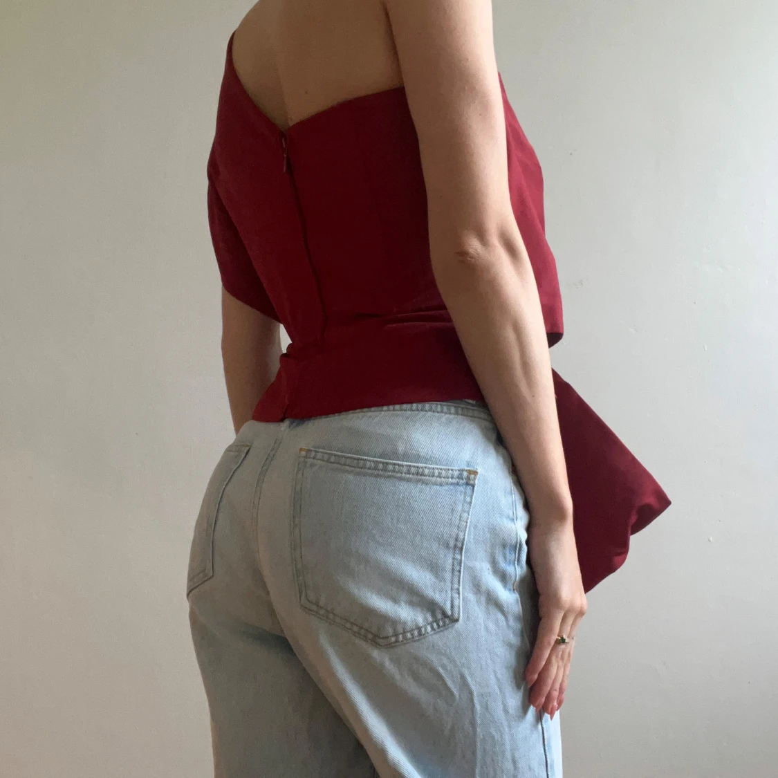 Säljer en vinröd, asymmetrisk topp med stor knutdetalj framtill och en axel bar. Toppen har dragkedja i ryggen och är tillverkad i ett slätt tyg. Perfekt för dig som vill sticka ut med en unik och trendig look