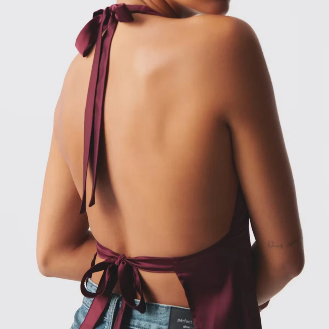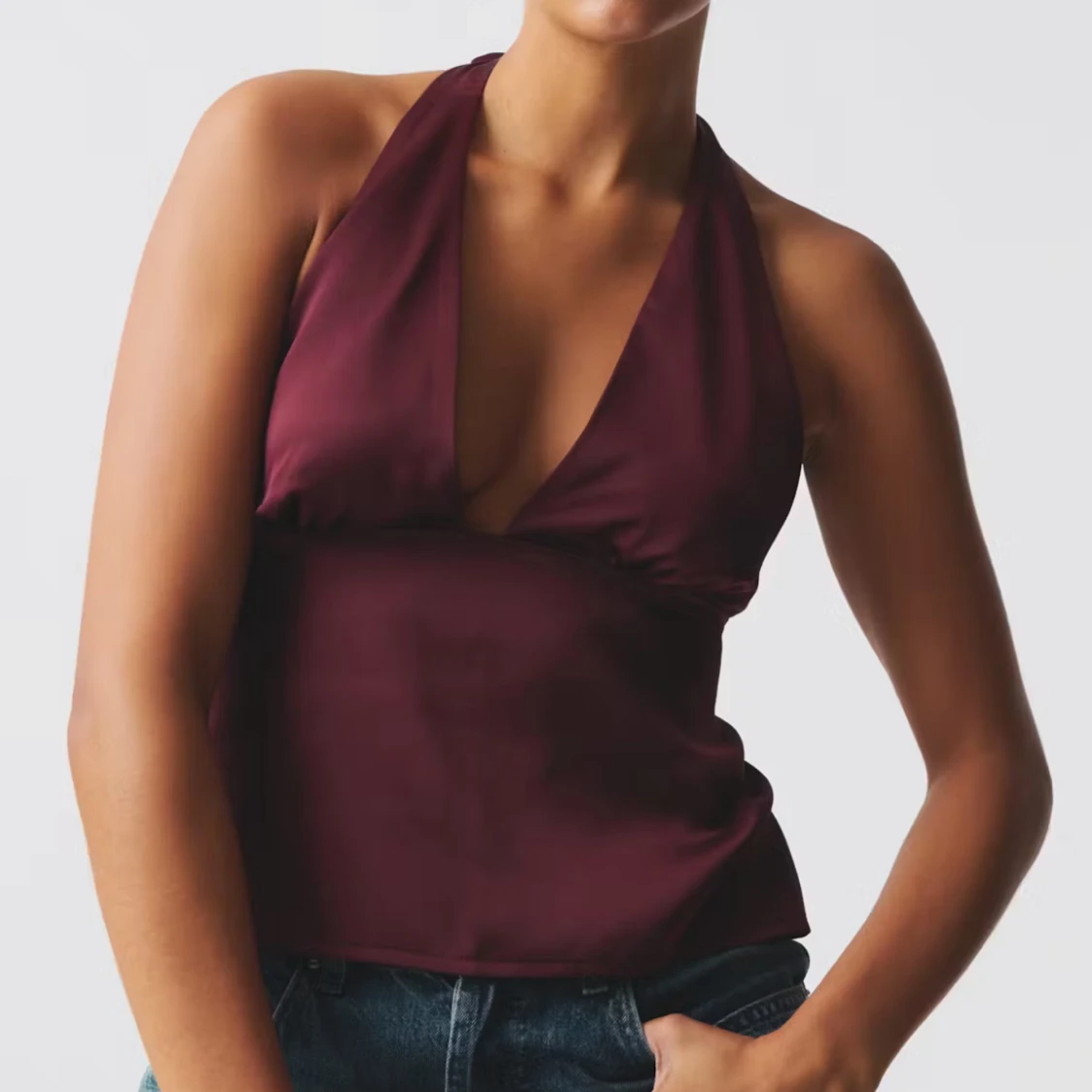 Säljer en vinröd halterneck topp i glansigt material med djup v-ringning och öppen rygg. Har använt vid endast ett tillfälle så i super bra skick. Nypris 360kr