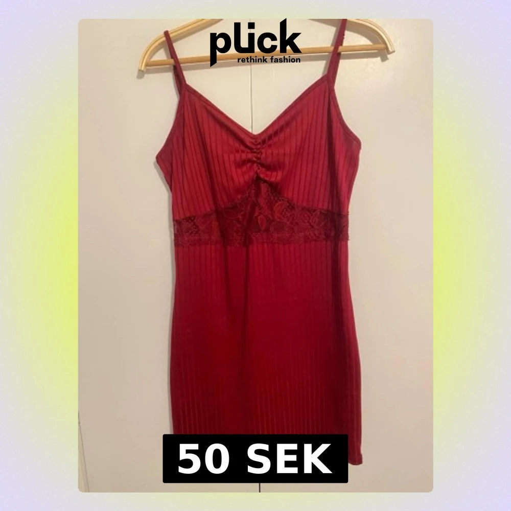 Snygg vinröd klänning med smala axelband och ribbad struktur. Toppen har ett dekorativt spetsband under bysten som ger en extra detalj. Det känns mjukt mot huden.