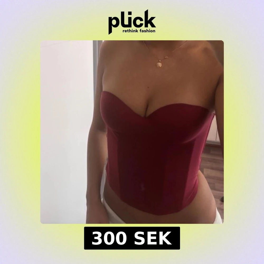 Säljer en vinröd korsett-topp med axelbandslös och bandeauformad design. Toppen har en snygg sweetheart-ringning och stängs med hakar i ryggen. Materialet är slätt och har en lätt glansig finish som ger en cool och trendig look.