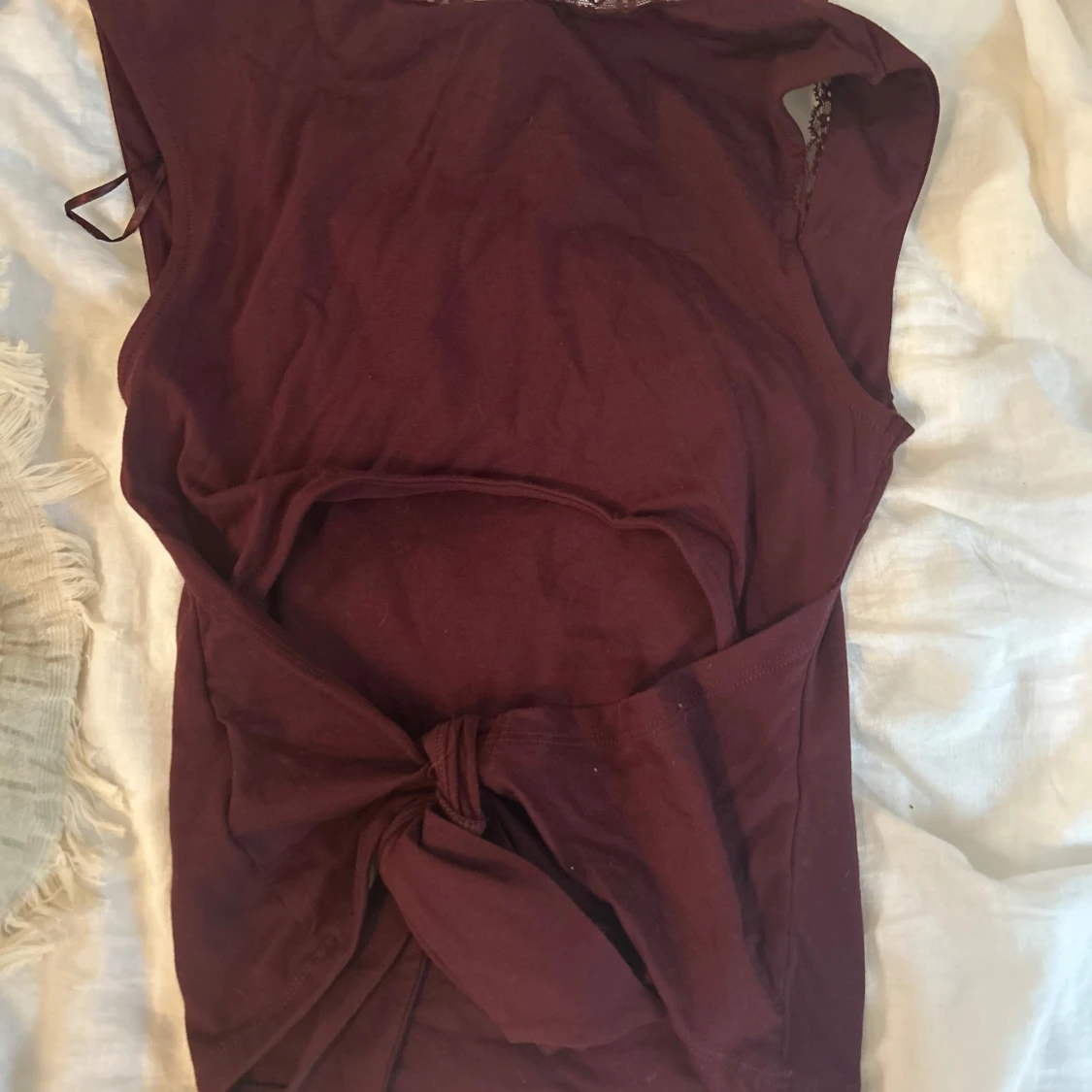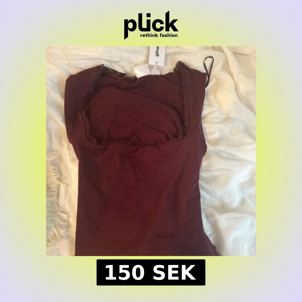 Supersnygg vinröd omlottopp från Gina Tricot med spetskant vid urringningen och smala axelband. Toppen har en knytning i midjan som ger en cool och feminin look. Perfekt att styla med jeans eller kjol för en trendig vibe.