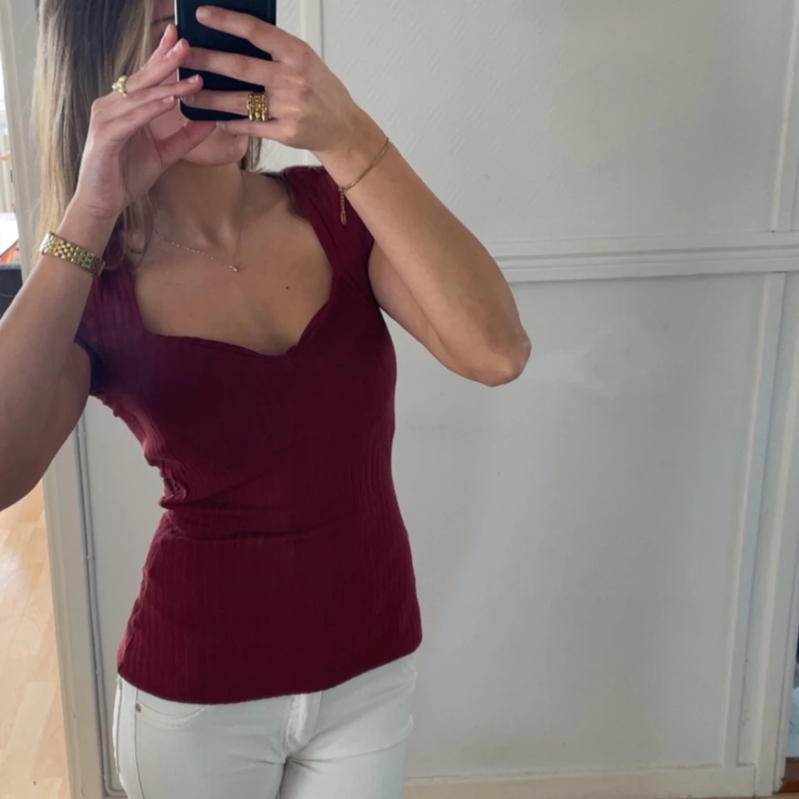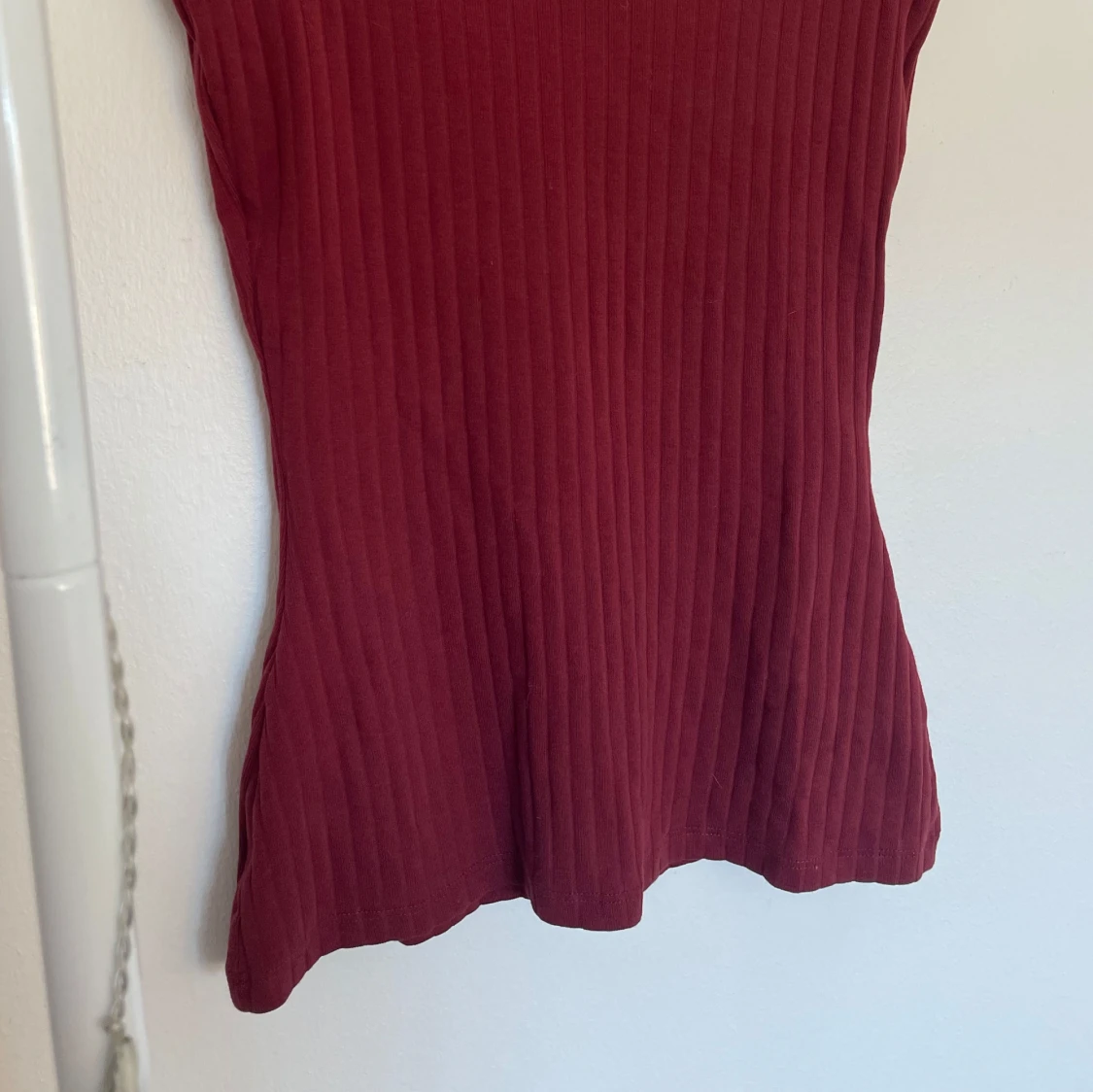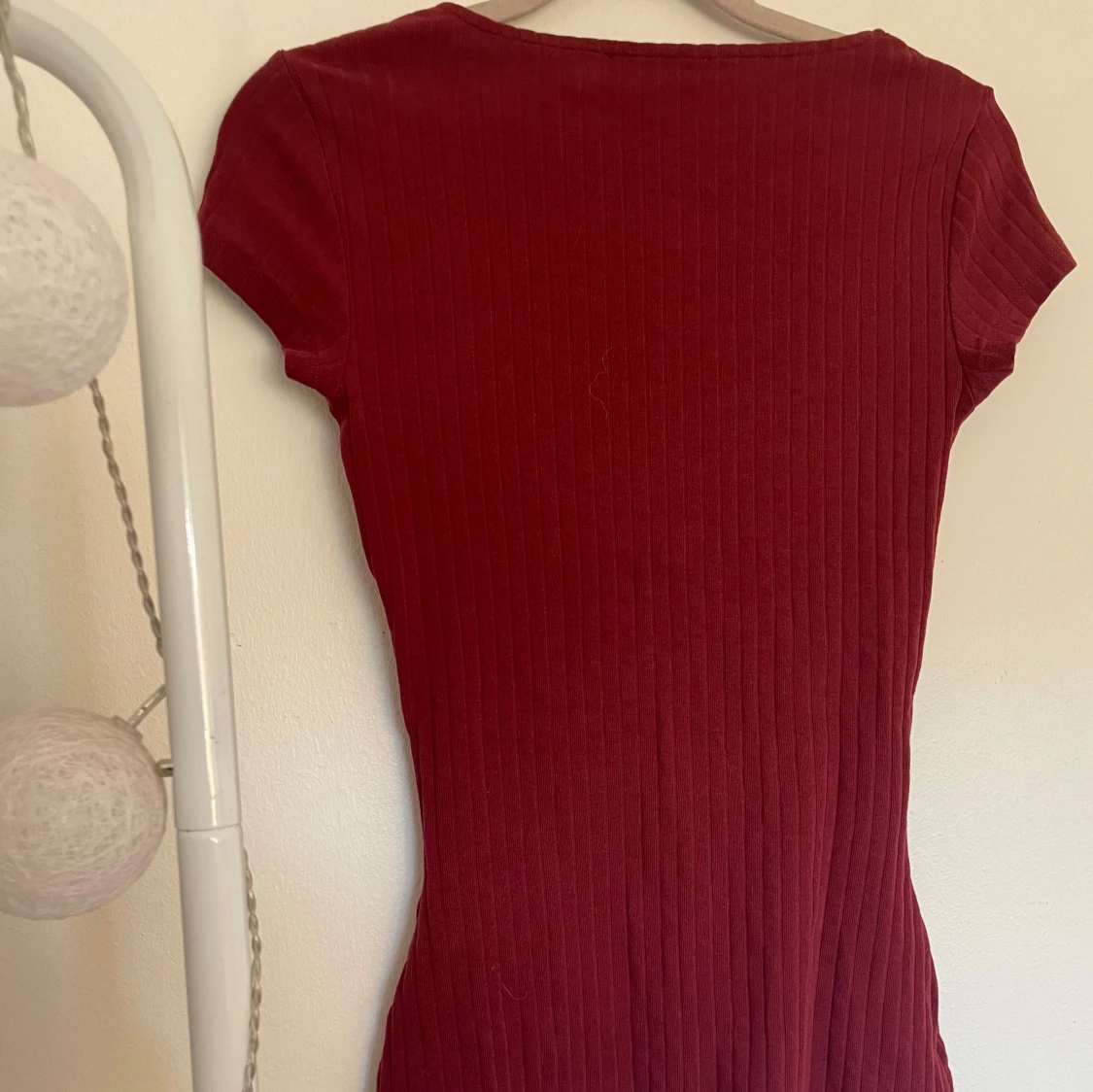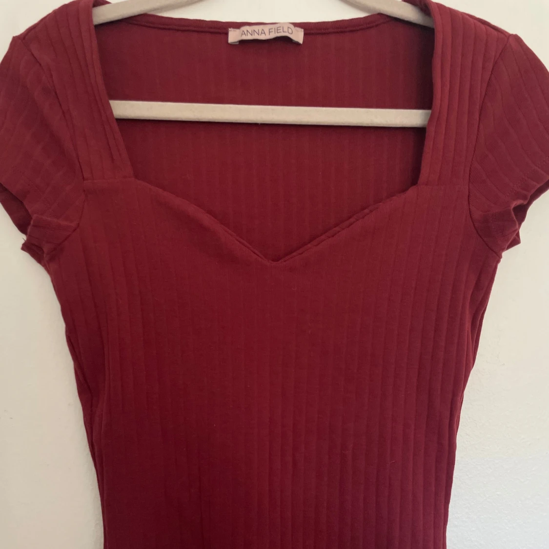 Vinröd ribbad topp från Anna Field med korta ärmar och v-ringning. I stl XS och har en figursydd passform💞