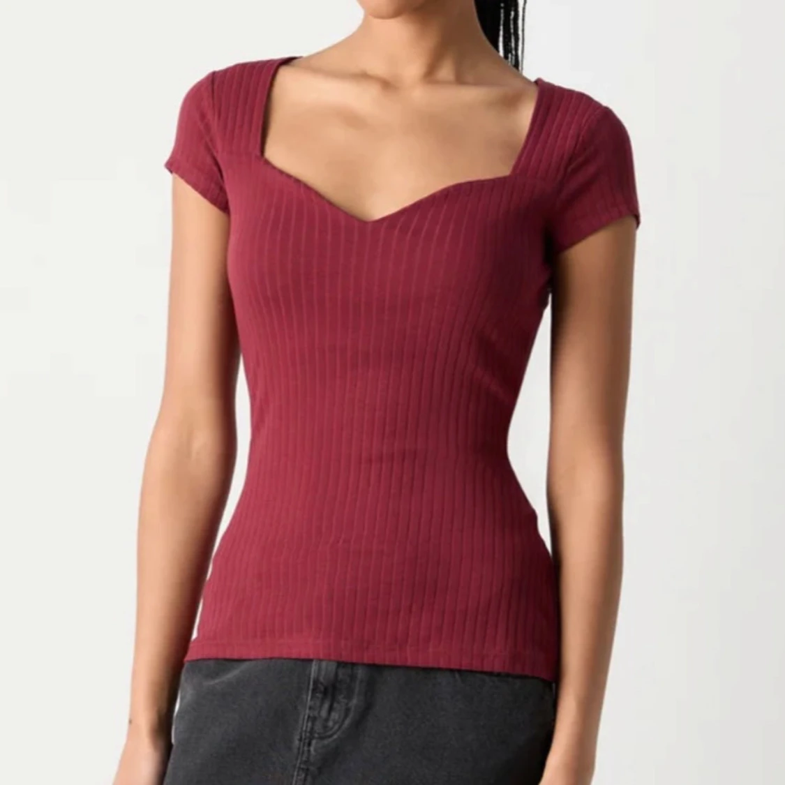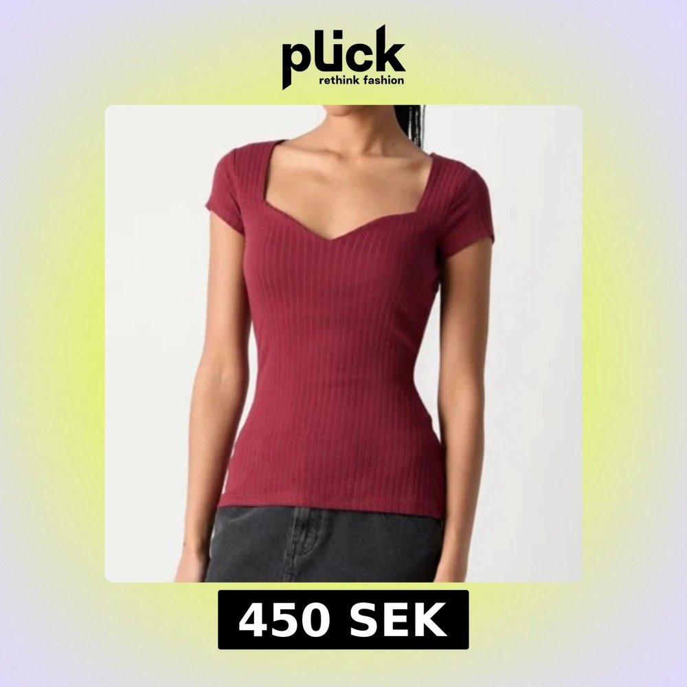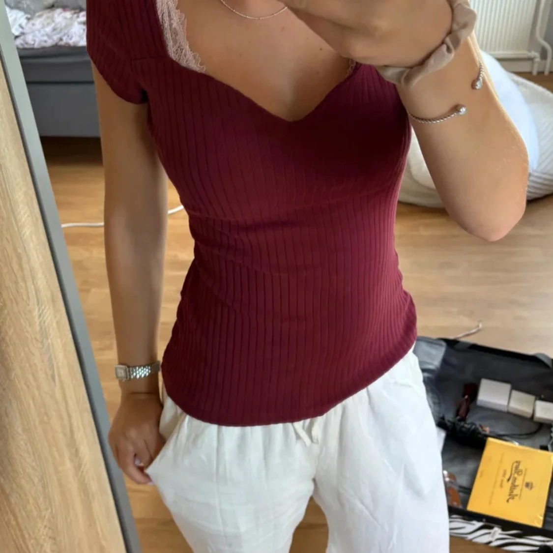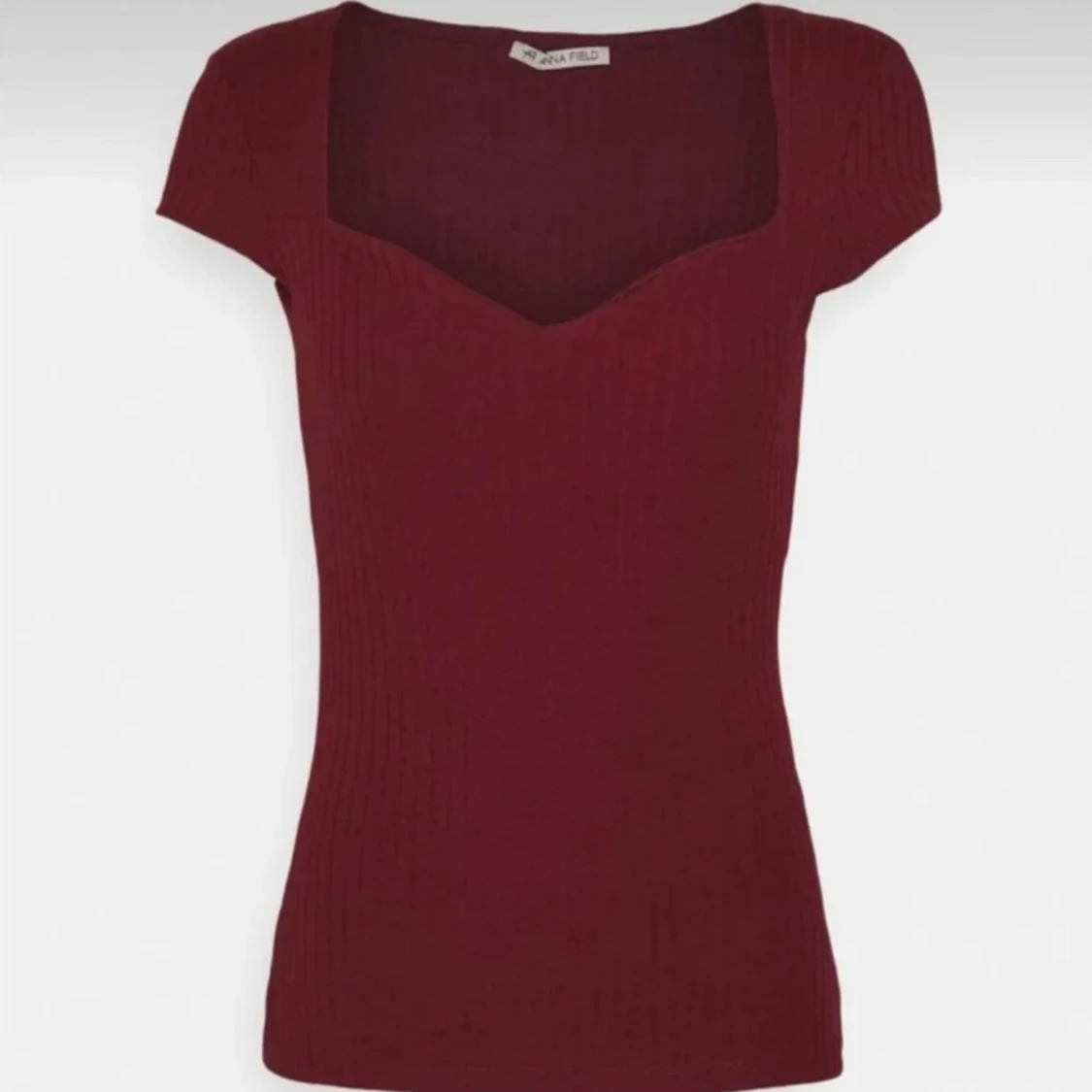 Snygg vinröd topp med korta ärmar och markerad v-ringning. Modellen är ribbad, så snygg! Endast testad