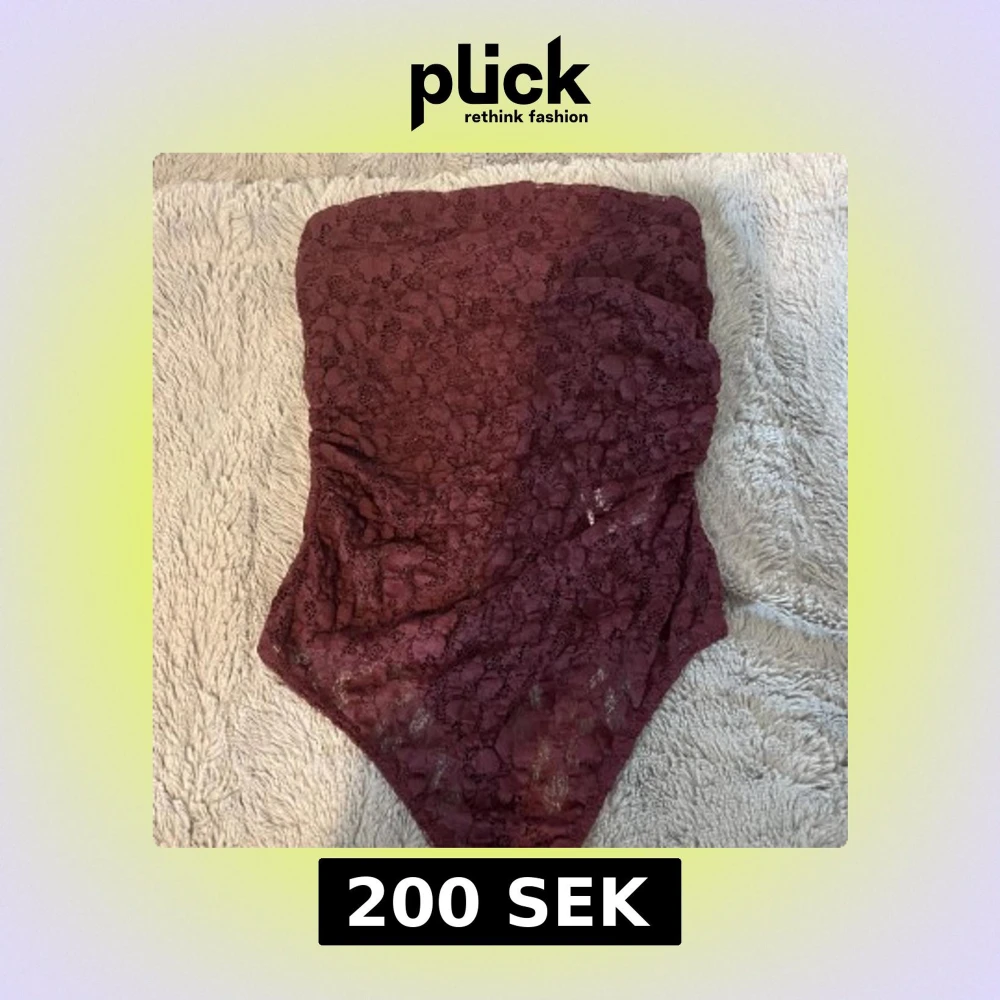 Säljer en vinröd tubtopp från Bershka i spets med blommigt mönster. Toppen är axelbandslös och har bodysuit-modell med tryckknappar nedtill. Det stretchar när man sätter på sig den, kan även visa hur den sitter på!