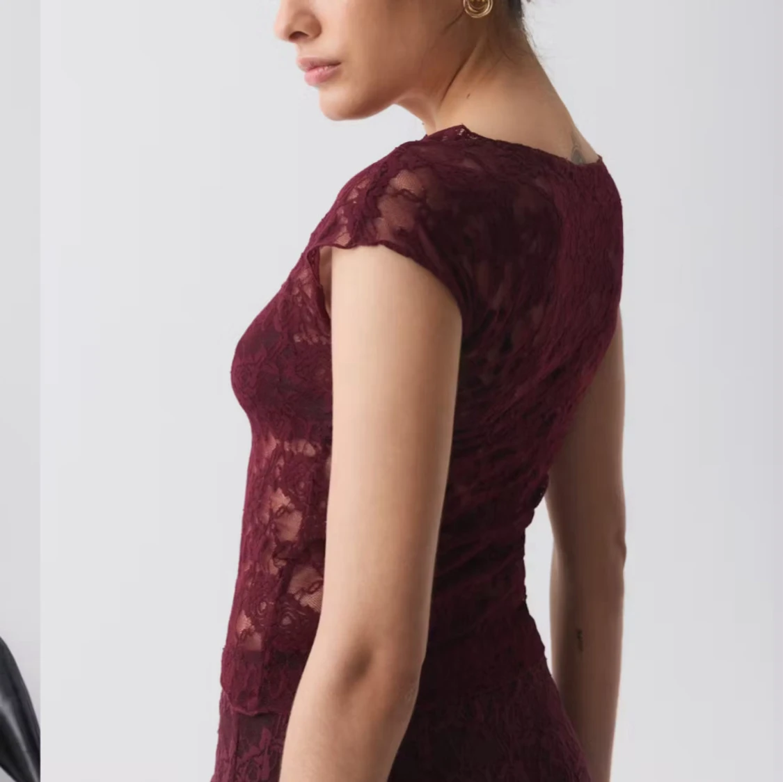 Säljer en vinröd blus i genombruten spets från Gina Tricot. Modellen är figurnära med korta ärmar och rund halsringning. Blusen har ett romantiskt blommönster i spetsen och är perfekt för att skapa en trendig och feminin look.