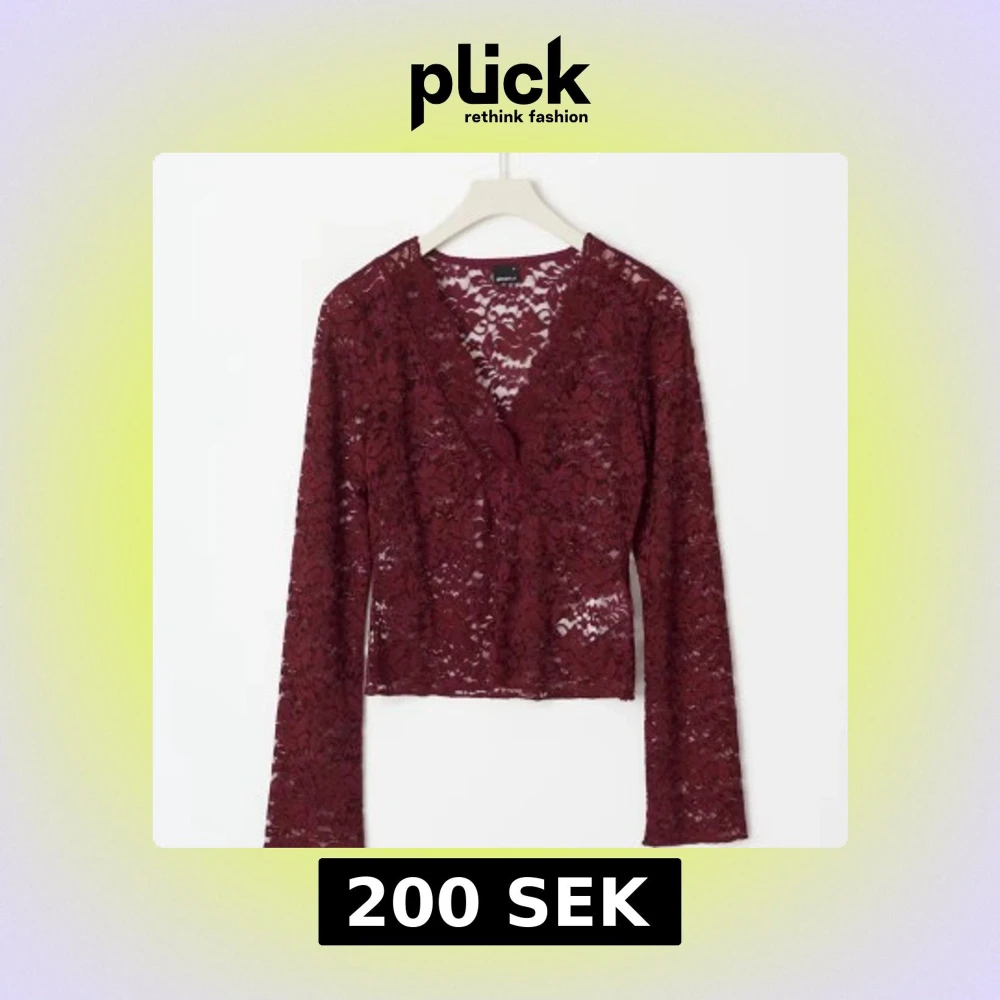 Säljer en vinröd blus från Gina Tricot i genombruten spets med v-ringad hals och långa ärmar. Blusen är croppad och har fina spetsdetaljer längs halsringningen.