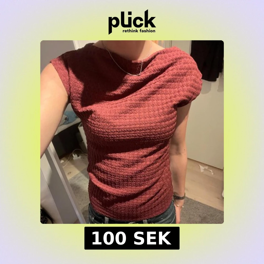 Säljer en vinröd topp med tight passform och korta ärmar. Tyget har en snygg strukturerad, nästan vågig yta som ger cool effekt. Modellen är enkel men ändå unik, perfekt till jeans eller kjol. Ingen synlig logga eller märke.