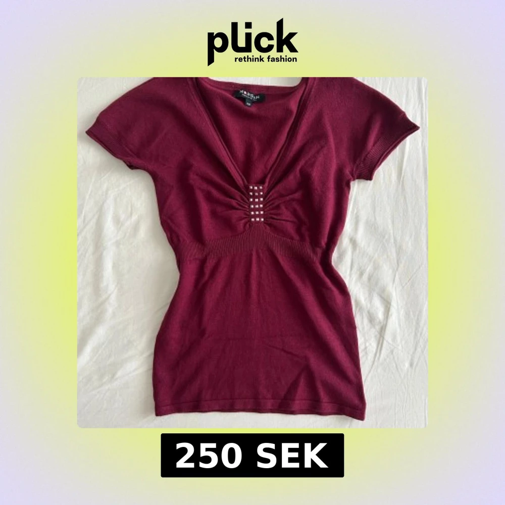 Supersnygg vinröd topp från Morgan med djup v-ringning och coola silvriga nitar framtill. Modellen är figurnära med ribbade muddar vid ärmslut och midja. Kortärmad och stretchig. I princip aldrig använd.