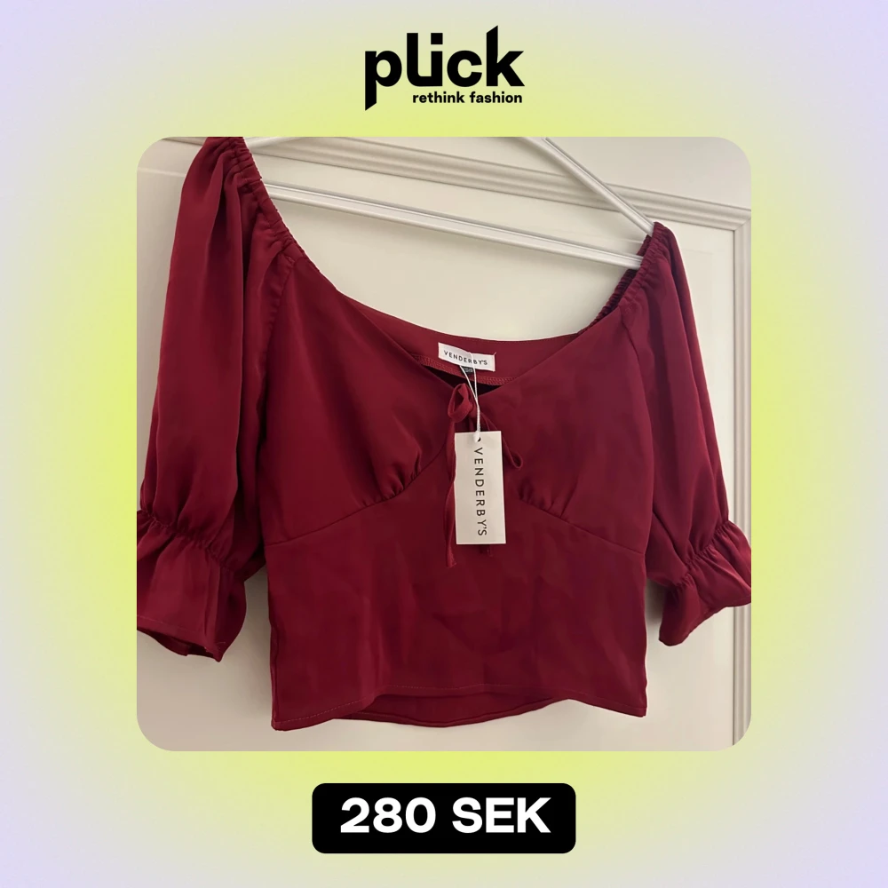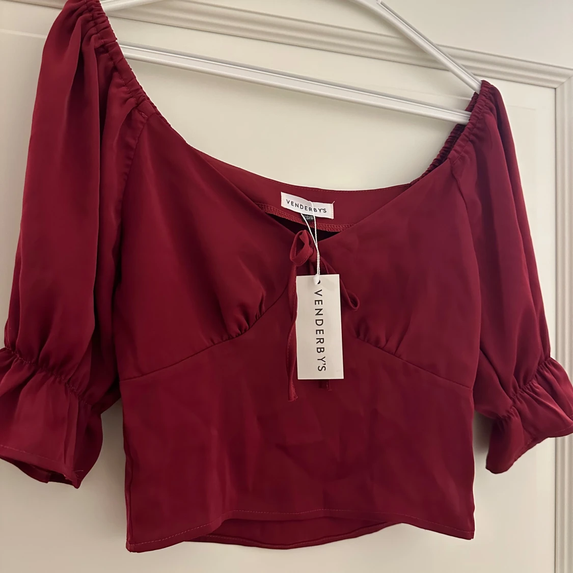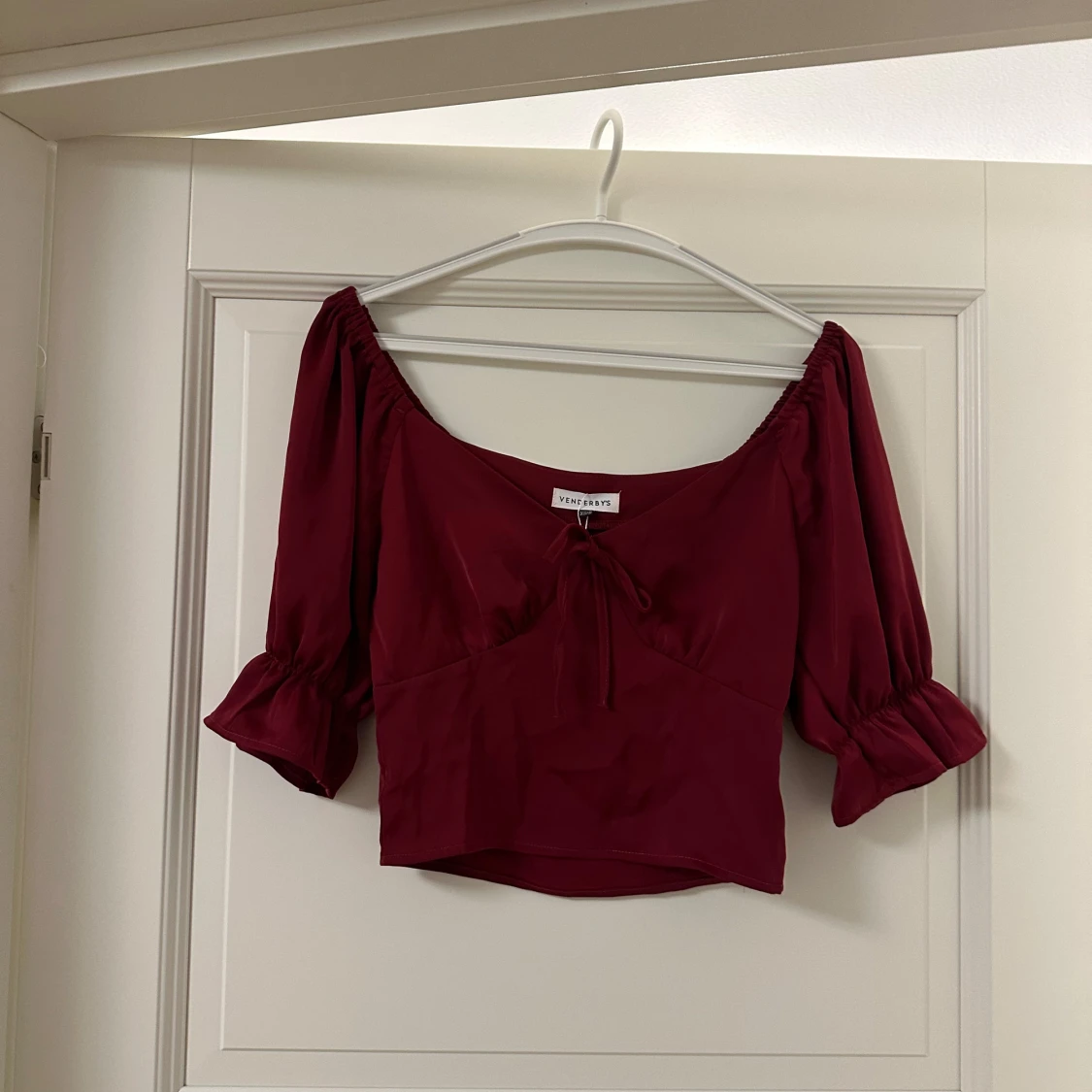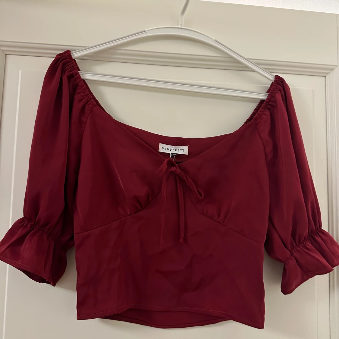 Snygg vinröd topp från Venderbys med korta puffärmar och en söt knytning framtill❤️Perfekt för en kväll ute eller en festlig tillställning. Toppen har en v-ringad design och är croppad för en trendig look.