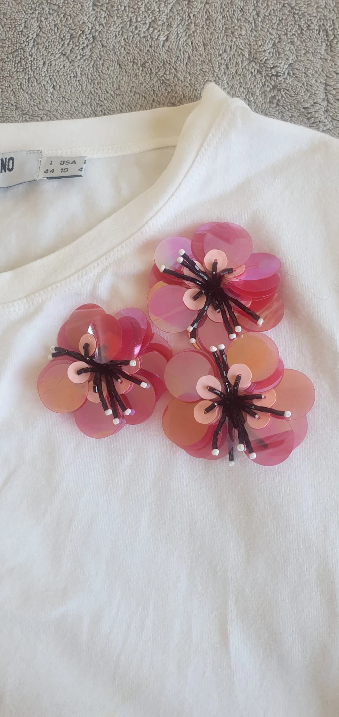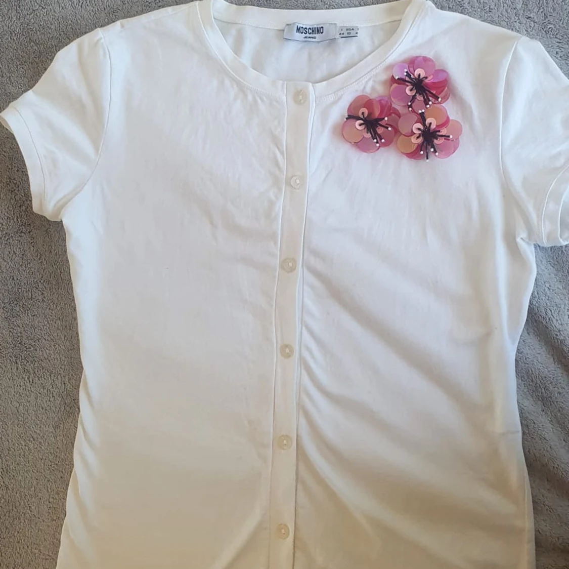 Super snygg vintage y2k T-shirt från Moschino. Super fin med rosa blomm detalj i paljett. Knappar. Italiensk 44, passar mig som har xs-s💗