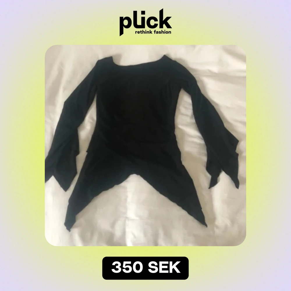 Svart långärmad topp från 90-tals märket GLITZY. Stretchigt dubbelfodrat tyg som sitter tight runt midjan om man är 80cm eller större. Symmetriskts sydd fåll och trumpetärmar. Finns inga bilder på men dma gärna vid andra frågor. Köparen står fö frakt