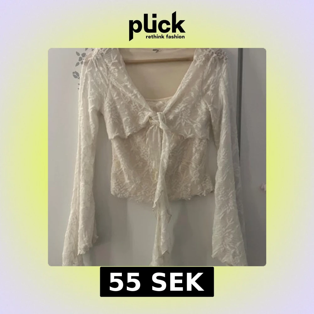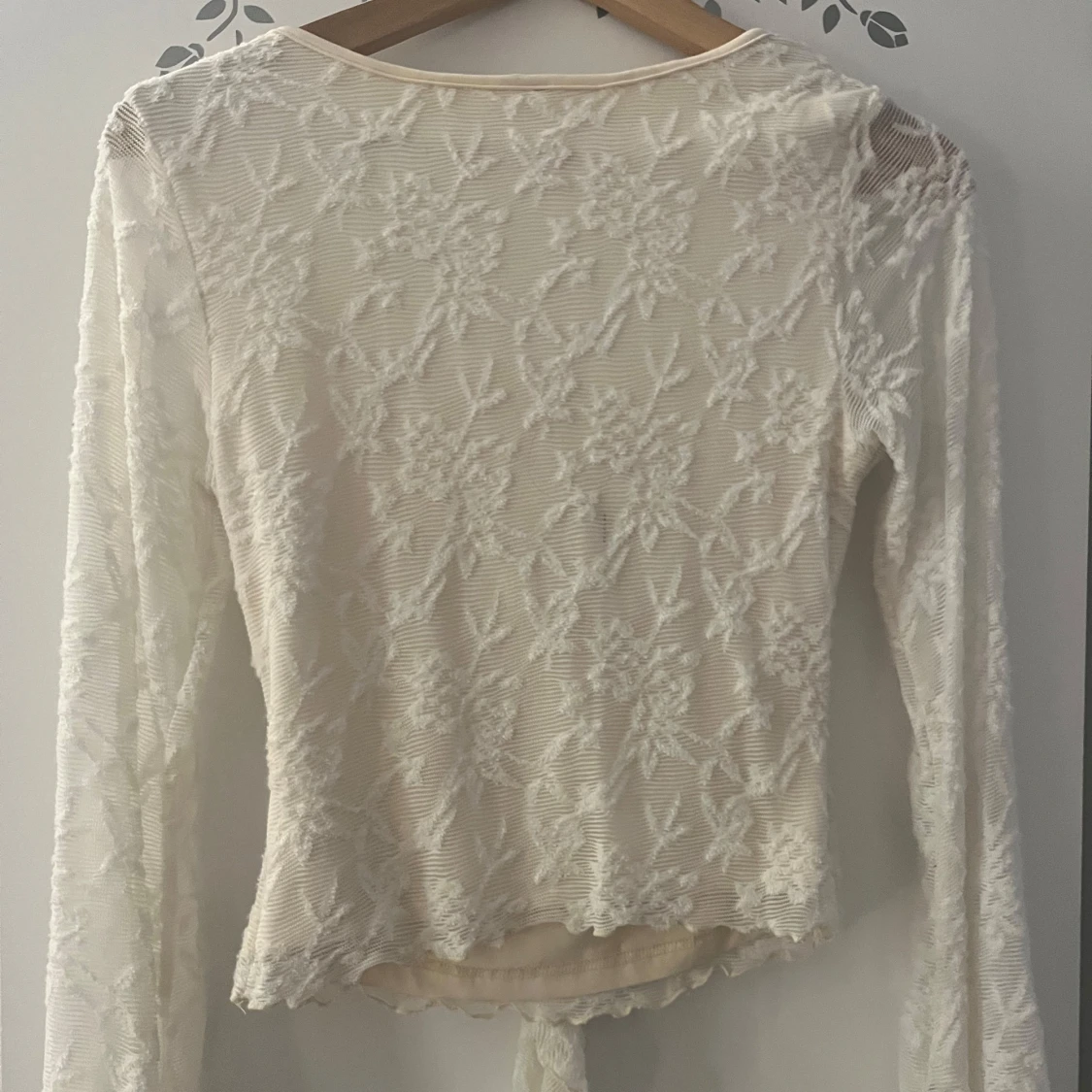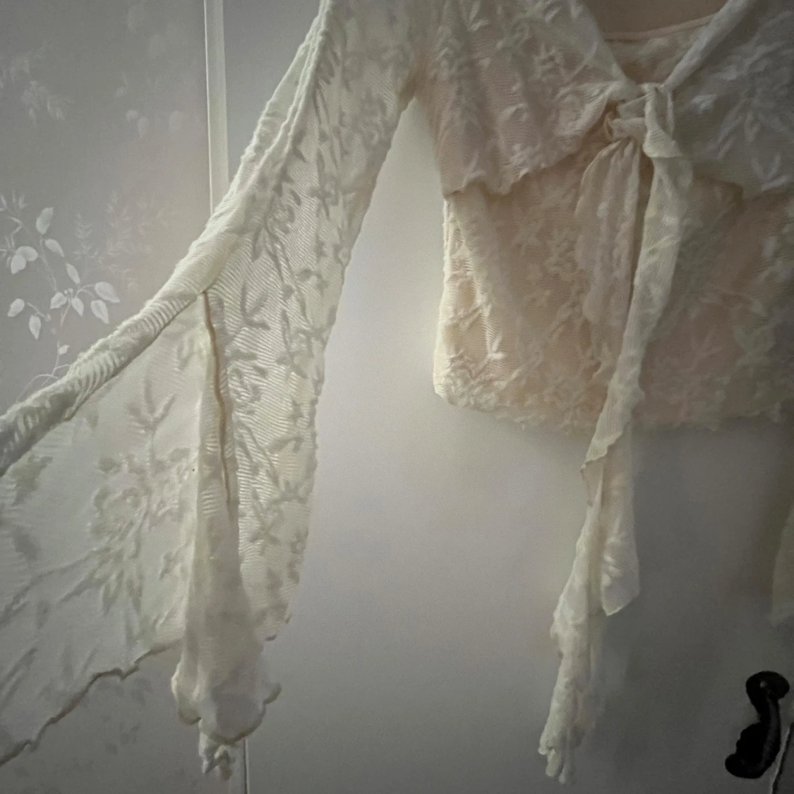 Superfin vit topp i spets med blommigt mönster och långa trumpetärmar. Toppen har omlottknytning framtill och är lätt transparent. Perfekt för dig som gillar romantisk och bohemisk stil. Snygg att styla med jeans eller kjol. 🤍🤍