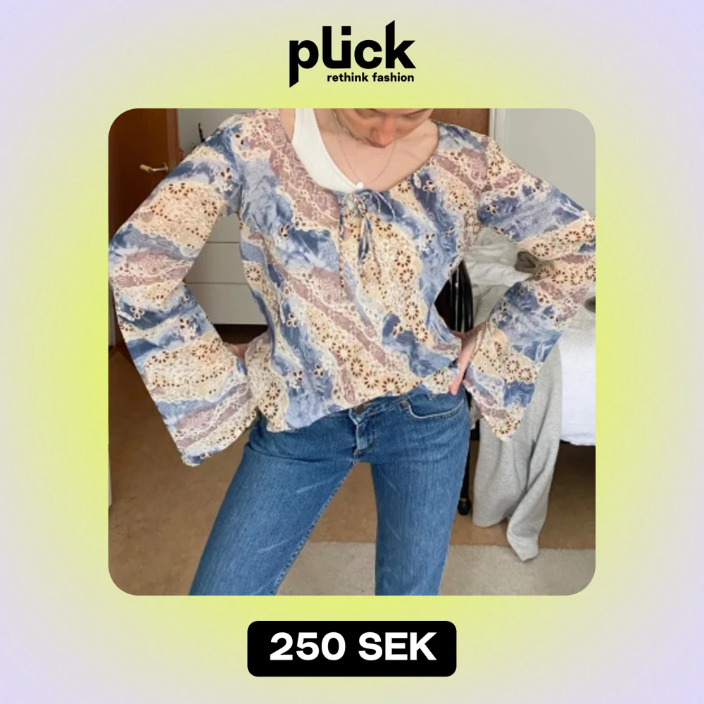 Super vacker och originell vintage blusđđ„passar perfekt till sommaren och ett par linnebyxorđDen Ă€r luftig med knytsnöre vid halsen och har armar som gĂ„r ut vid Ă€nden.