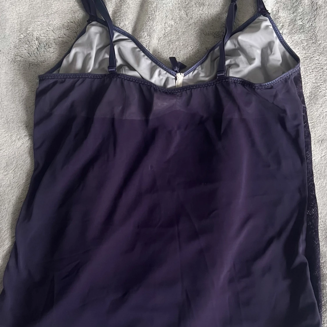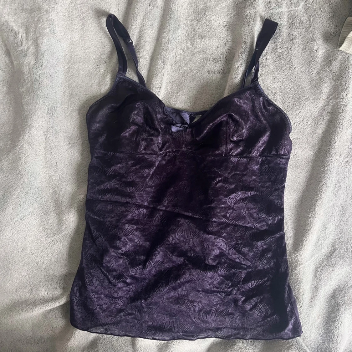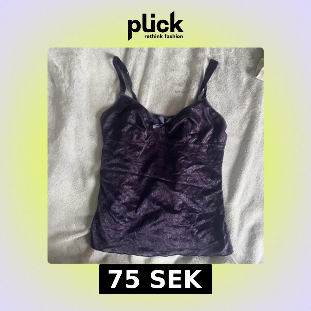 Säljer en lila linnetopp i spets med smala axelband och en liten rosett framtill. Toppen har en lätt glansig yta och figurnära passform, perfekt att styla till olika outfits. Den är även lite genomskinlig. Storlek : 38-40, M