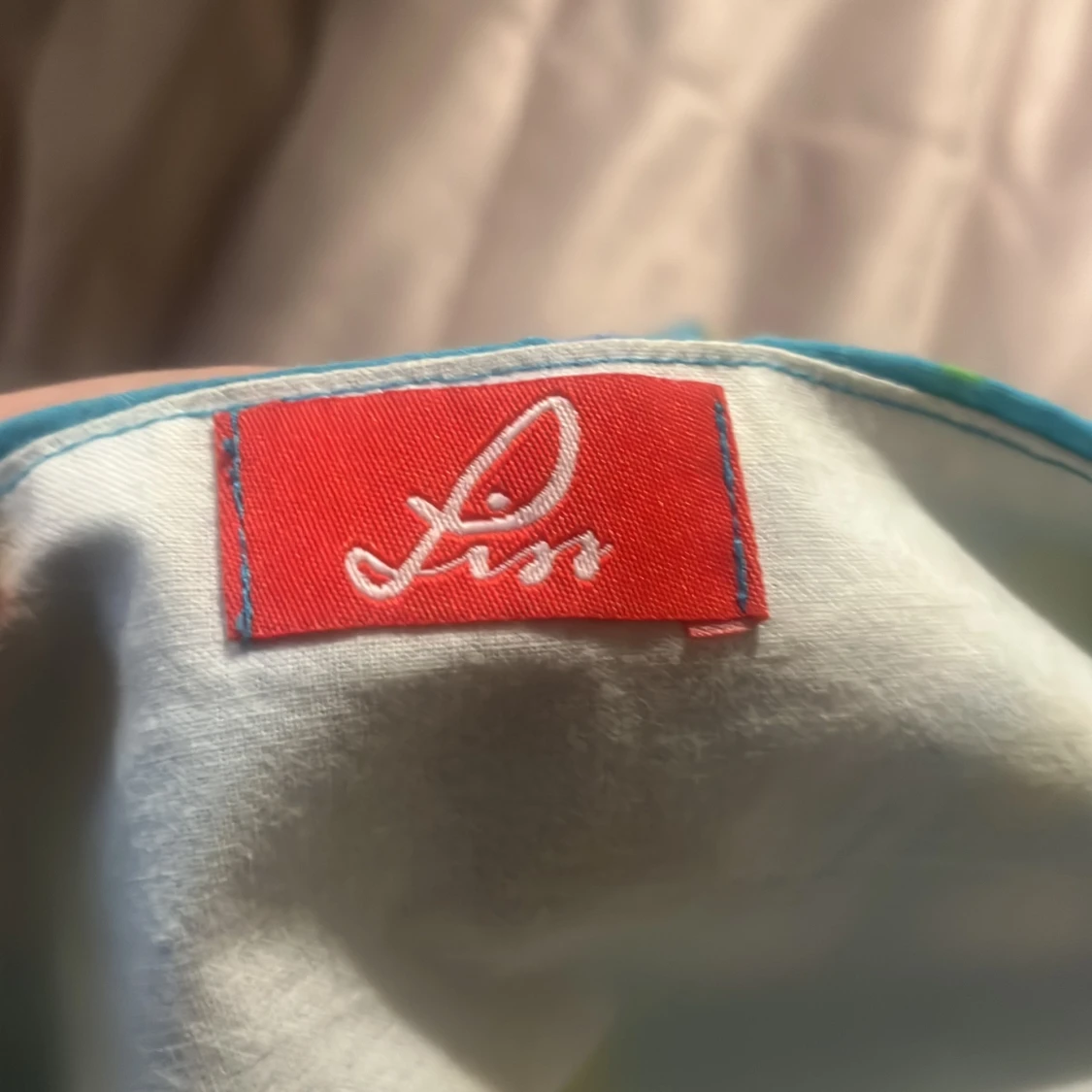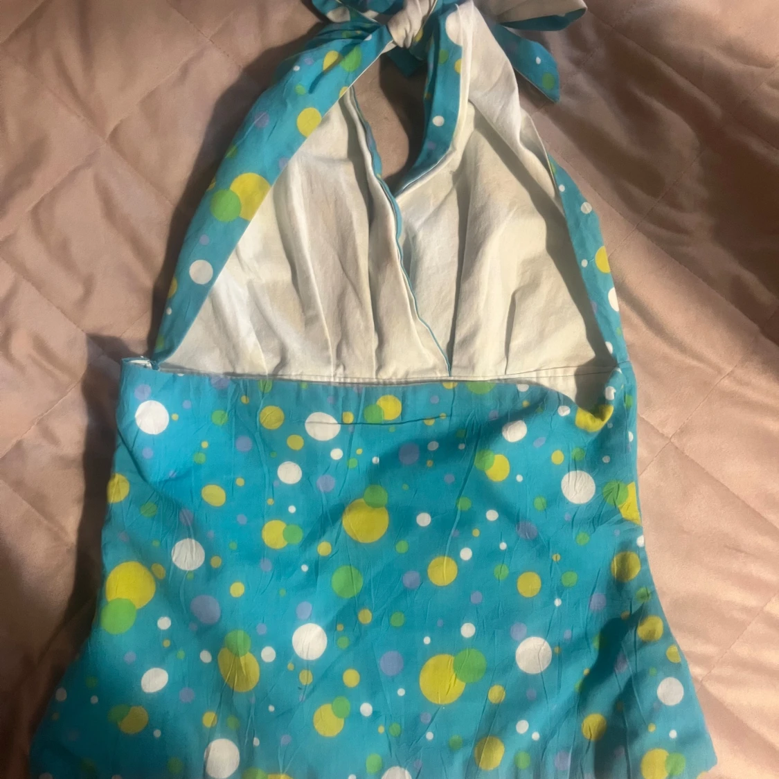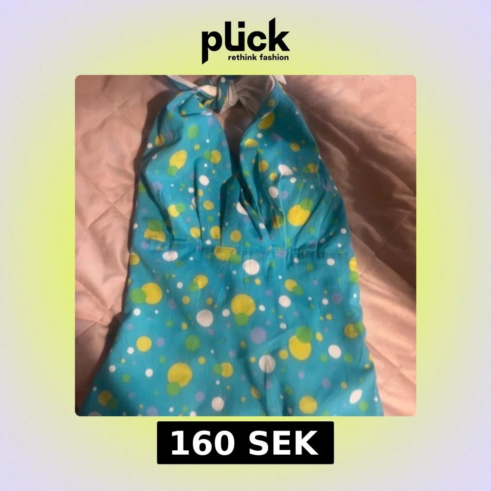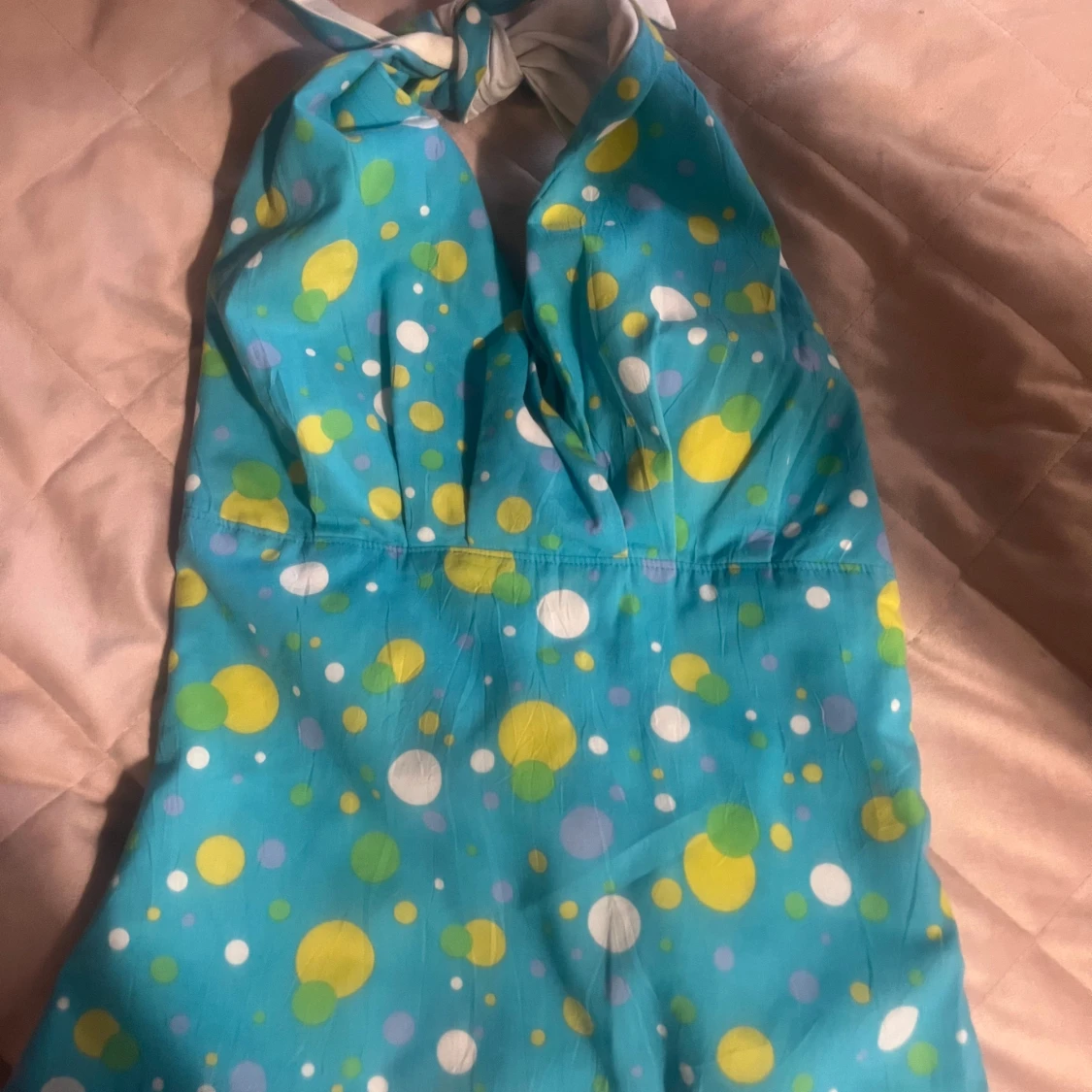 Säljer en turkos halternecktopp från Liss med färgglatt prickigt mönster i gult, vitt och grönt. Toppen har knyt i nacken och v-ringning framtill samt är i 80-tals stil