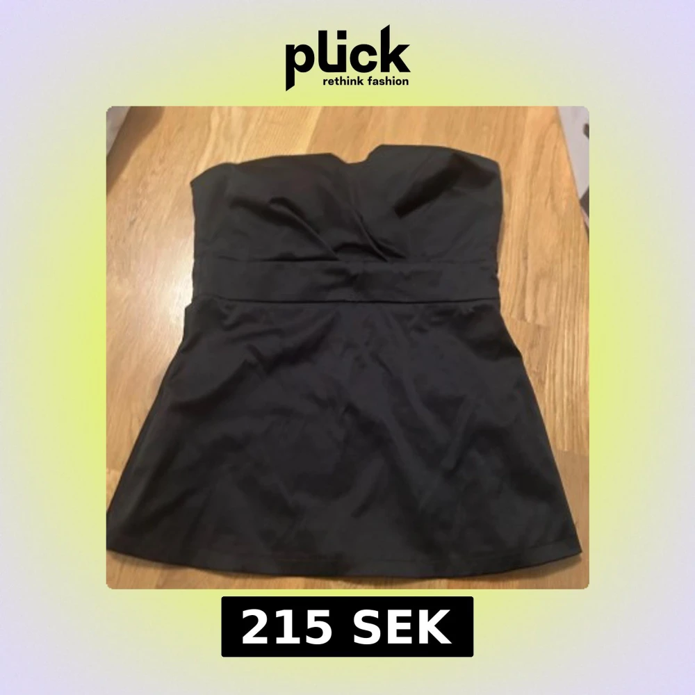 Säljer en svart axelbandslös tubtopp från Pimkie. Toppen har en markerad midja och lätt utsvängd nederdel. Sitter uppe med hjälp av silikonband på insidan och har en slät, stilren look. Perfekt för dig som gillar minimalistisk stil. Liten defekt see i bild 4