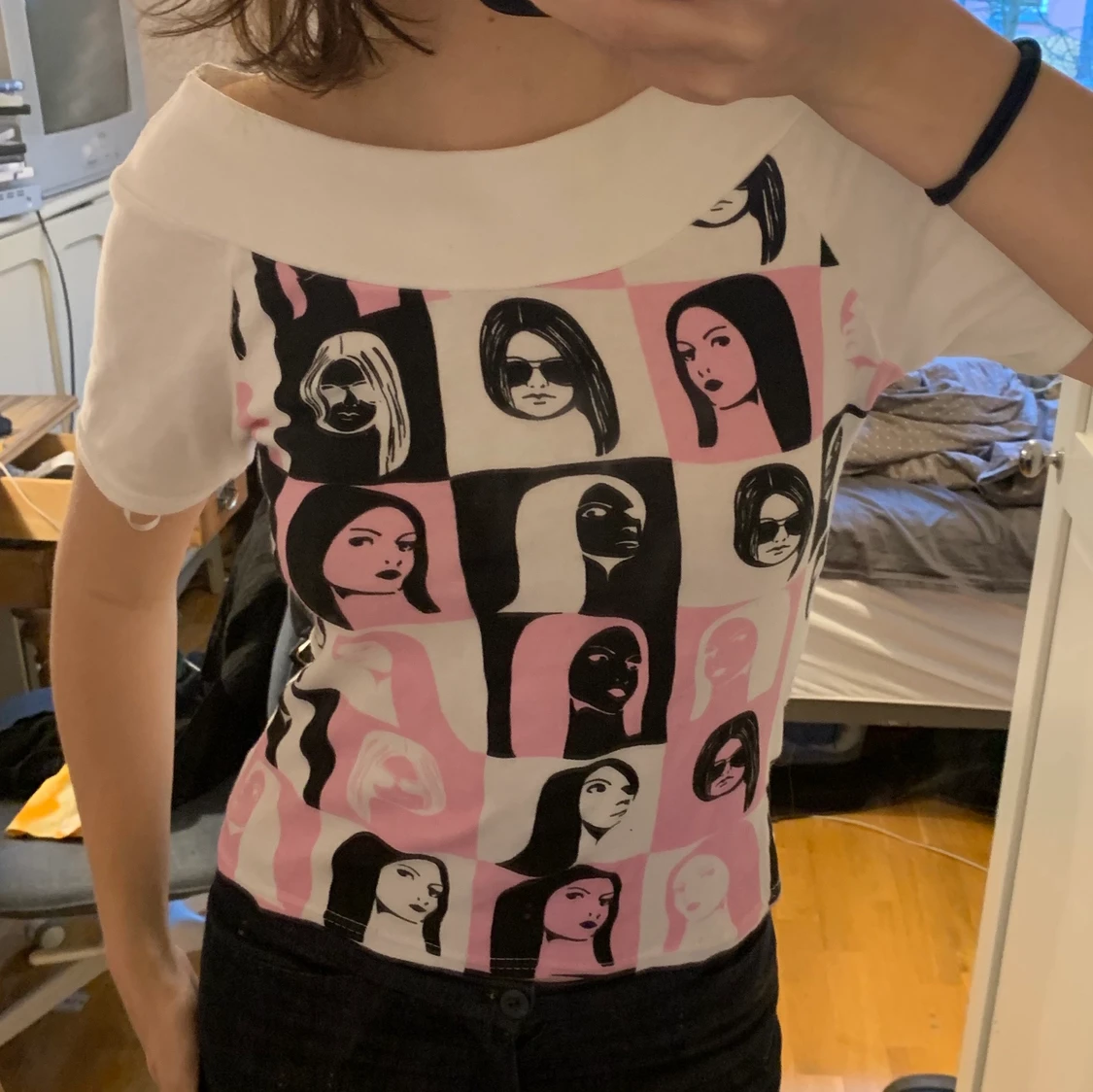 Topp som jag köpte second hand med tryck på! Supercool och har inte sett något liknande. Den har inget märke på sig. Frakt 66kr!