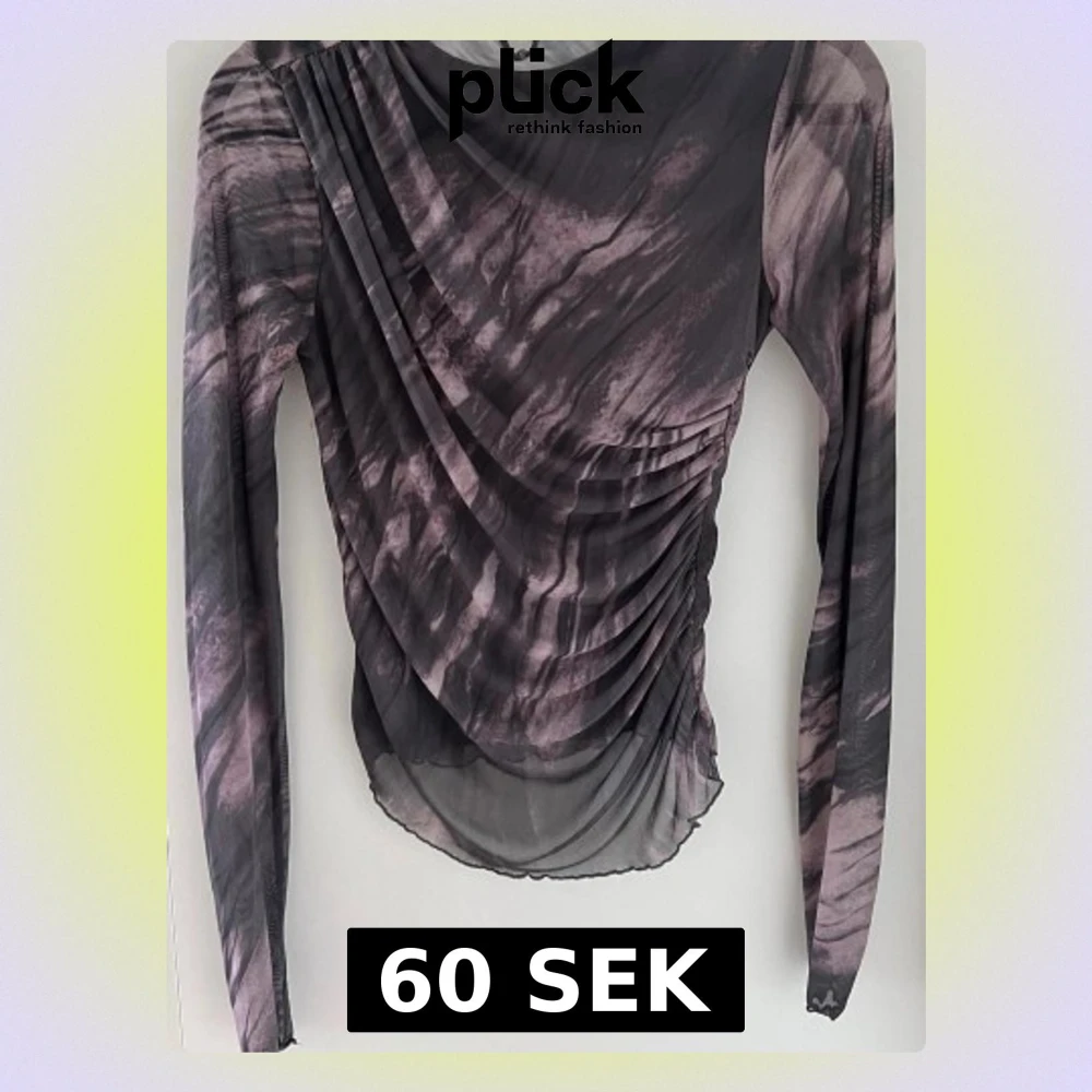 Långärmad topp i stretchig mesh med gråsvart mönster. Transparent material med rynk/drapering framtill som ger fin passform. Rund hals med knappstängning bak. Lätt och följsam i tyget. Passar perfekt till jeans, kjol eller över linne/bh. Fint skick. Storlek: S
